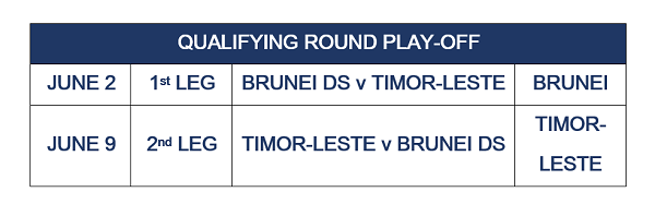 สำหรับรอบคัดเลือก เพลย์ออฟ บรูไน ดารุสซาลาม และ ติมอร์-เลสเต จะพบกันแบบเหย้า-เยือน เพื่อแย่งชิงตั๋วเข้าสู่รอบแบ่งกลุ่ม โดยเลกแรก บรูไน ดารุสซาลาม จะเป็นเจ้าภาพในวันที่ 2 มิถุนายน ก่อนที่เลกสอง ติมอร์-เลสเต จะเปิดบ้านรับการมาเยือนในวันที่ 9 มิถุนายน