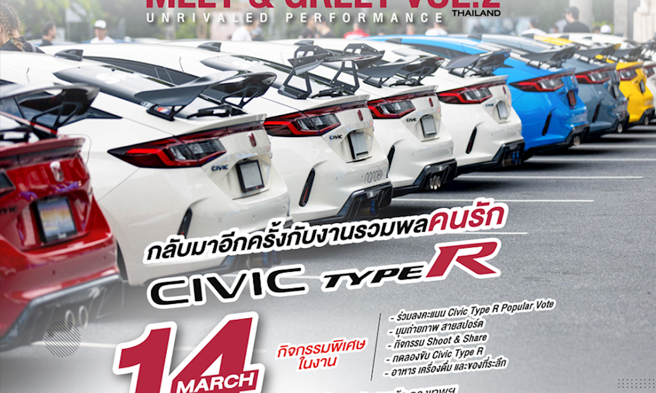 บริษัท ฮอนด้า ออโตโมบิล (ประเทศไทย) จำกัด จัดงานรวมตัวครั้งยิ่งใหญ่ของชาวแฟน ๆ สายสปอร์ตคนรัก Honda Civic Type R ในกิจกรรม Honda Civic Type R Fan Meet #2: The Unrivaled Performance ในวันเสาร์ที่ 14 มีนาคม 2569 ณ ศูนย์ฝึกขับขี่ปลอดภัยฮอนด้า ถนนรามคำแหง พร้อมเปิดรับสมัครผู้ที่สนใจเข้าร่วมกิจกรรมโดยลงทะเบียนผ่าน QR Code ในภาพผ่านช่องทาง Facebook: Honda Thailand ตั้งแต่วันที่ 24 กุมภาพันธ์ – 5 มีนาคม 2569 สิทธิ์มีจำนวนจำกัด