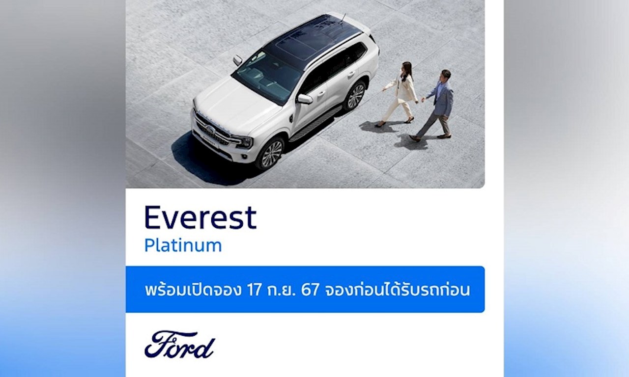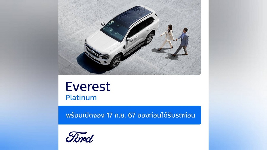 ฟอร์ด ประเทศไทย เดินหน้าต่อยอดความสำเร็จจากเสียงตอบรับที่ดีเยี่ยมจากลูกค้า ประกาศเปิดรับจองฟอร์ด เอเวอเรสต์ แพลทินัม ขุมพลังเครื่องยนต์ดีเซล 3.0 ลิตร วี 6 ล็อตใหม่ ไม่จำกัดจำนวน ราคาเดิม 2,279,000 บาท เปิดจองพร้อมกันทั่วประเทศในวันที่ 17 กันยายน 2567 เวลา 10:00 น. เป็นต้นไป ผ่านช่องทางออนไลน์ www.ford.co.th พร้อมเชิญชวนผู้ที่สนใจร่วมสัมผัสประสบการณ์การขับขี่ฟอร์ด เอเวอเรสต์ แพลทินัมที่จะทำให้คุณรู้สึกถึงความ ‘กล้าทุกความท้าทาย’ ในกิจกรรม ‘The Unexpected Driving Experience’ วันที่ 5-6 ตุลาคมนี้ ณ สนามปทุมธานี สปีดเวย์ ผู้ที่สนใจสามารถติดตามข่าวสารและลงทะเบียนร่วมกิจกรรมได้แล้ววันนี้ทางเว็บไซต์ www.EverestTestDrive.com