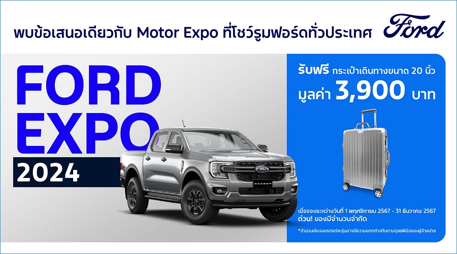 ฟอร์ด ประเทศไทย จัดแคมเปญสุดคุ้มส่งท้ายปี ‘ฟอร์ด เอ็กซ์โป’ มอบข้อเสนอเดียวกับงานมอเตอร์ เอ็กซ์โป สำหรับรถฟอร์ดหลากหลายรุ่นเพื่อให้ตอบโจทย์การใช้งานทุกรูปแบบด้วยข้อเสนอสุดเร้าใจมากมาย อาทิ ฟอร์ด เรนเจอร์ XLS รุ่นใหม่ล่าสุด ราคาพิเศษช่วงเปิดตัวเพียง 799,000 บาท ฟอร์ด เอเวอเรสต์ เทรนด์ ราคาพิเศษ 1,249,000 บาท ฟอร์ด เรนเจอร์ แร็พเตอร์ ดอกเบี้ย 0.99% พิเศษ! เมื่อลูกค้าจองรถฟอร์ดรุ่นใดก็ได้ ระหว่างวันที่ 1 พฤศจิกายน ถึง 31 ธันวาคม 2567 ที่โชว์รูมฟอร์ดทั่วประเทศ รับฟรี กระเป๋าเดินทางฟอร์ดดีไซน์หรู มูลค่า 3,900 บาท