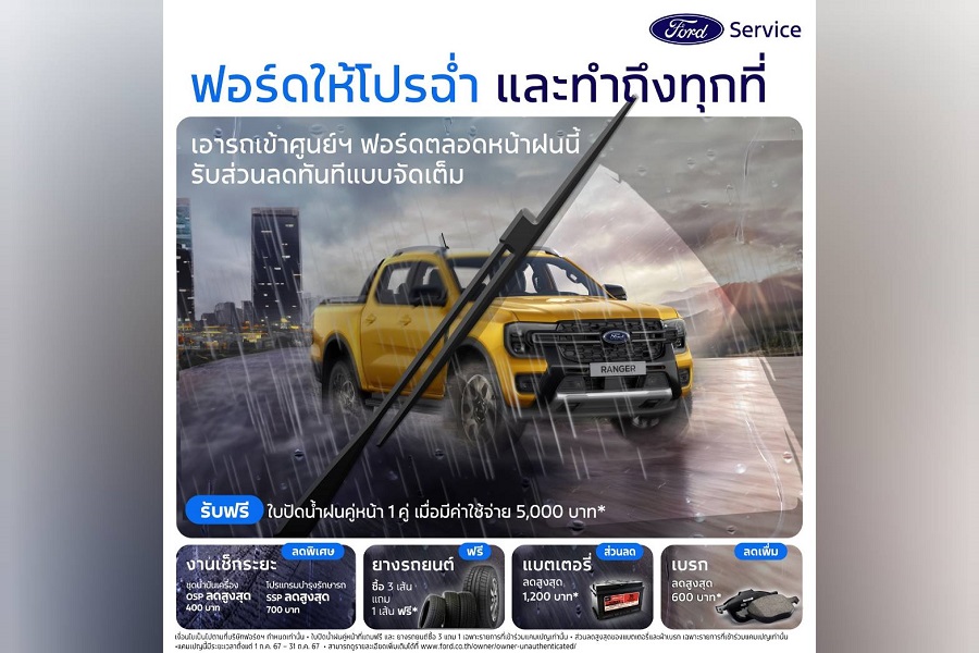 ฟรี ใบปัดน้ำฝนคู่หน้า 1 คู่ เมื่อลูกค้าทำการเช็กระยะและมีค่าใช้จ่ายตั้งแต่ 5,000 บาท ขึ้นไป สำหรับลูกค้ารถยนต์ฟอร์ดทุกรุ่น ไม่จำกัดระยะทาง ทั้งนี้ ค่าใช้จ่ายที่ร่วมรายการ ได้แก่ ค่าอะไหล่และของเหลว ค่าโปรแกรม OSP หรือ SSP หรือ Ford Care รวมถึงค่าอุปกรณ์ตกแต่งแท้ฟอร์ด