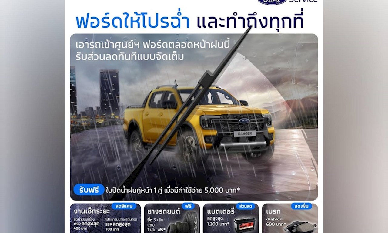 ฟอร์ดให้ความสำคัญกับการดูแลรถยนต์และการขับขี่ที่ปลอดภัยในทุกสภาพอากาศ ซึ่งฤดูฝนนับเป็นช่วงเวลาที่ต้องอาศัยการดูแลรถเป็นพิเศษ จึงได้ออกแคมเปญพิเศษเพื่อให้ลูกค้าฟอร์ดเดินทางได้อย่างปลอดภัยในทุกเส้นทางจากข้อเสนอด้านบริการมากมาย คัดสรรมาเพื่อตอบโจทย์การใช้งานรถ และเสริมความอุ่นใจตลอดการเดินทาง ได้แก่