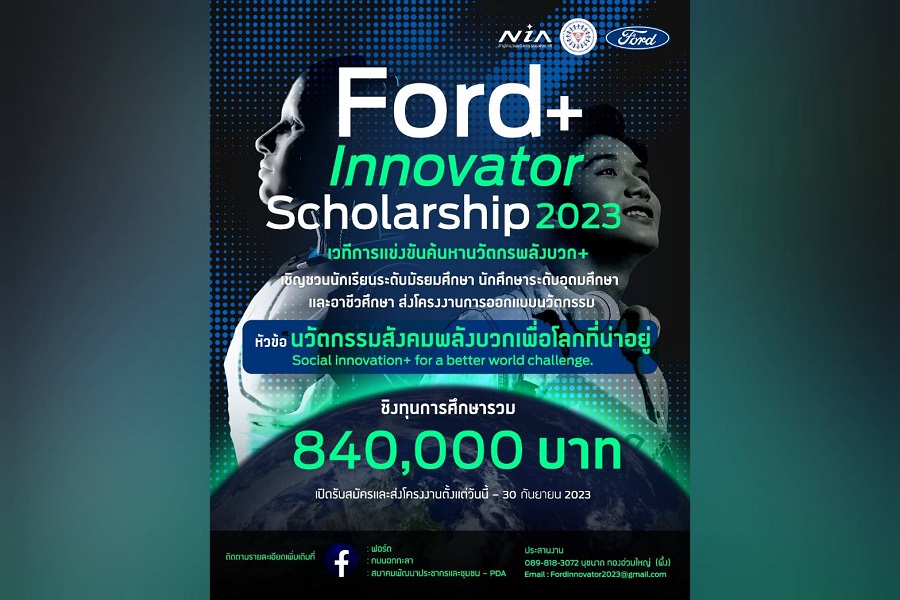 ฟอร์ด ประเทศไทย ร่วมกับสมาคมพัฒนาประชากรและชุมชน (Population and Community Development Association - PDA) สำนักงานนวัตกรรมแห่งชาติ (National Innovation Agency - NIA) และบริษัท ทีวีบูรพา จำกัด จัดโครงการ Ford+ Innovator Scholarship 2023 ต่อเนื่องเป็นปีที่ 9 เปิดพื้นที่ให้เยาวชนร่วมประชันไอเดียนวัตกรรมและการออกแบบสิ่งประดิษฐ์ ในหัวข้อ นวัตกรรมทางสังคมพลังบวกเพื่อยกระดับโลกให้น่าอยู่ (Social innovation+ for a better world challenge) ชิงทุนการศึกษาจำนวน 12 ทุน รวม 840,000 บาท นักเรียน นักศึกษาในระดับมัธยมศึกษา อาชีวศึกษา และอุดมศึกษาที่สนใจ สามารถสมัครเข้าร่วมโครงการและส่งผลงานได้ตั้งแต่วันที่ 15 สิงหาคม – 30 กันยายน 2566