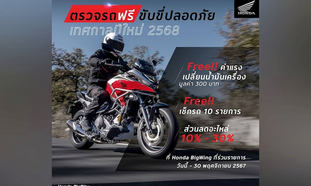 ฮอนด้าบิ๊กไบค์ ชวนผู้ขับขี่ร่วมส่งท้ายปีอย่างปลอดภัยผ่านแคมเปญพิเศษ ‘ตรวจรถฟรี ขับขี่ปลอดภัยเทศกาลปีใหม่ 2568’ เปิดโอกาสให้ลูกค้าผู้ขับขี่รถจักรยานยนต์ฮอนด้าบิ๊กไบค์ ตรวจเช็กสุขภาพรถฟรีตลอดทั้งเดือนตั้งแต่วันนี้จนถึงวันที่ 30 พฤศจิกายน 2567