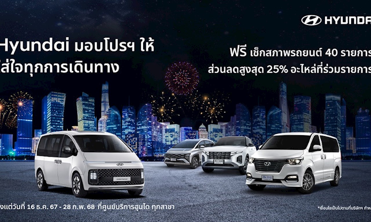 เทศกาลแห่งความสุขมาถึงแล้ว เพื่อให้ทุกการเดินทางของคุณและคนที่คุณรักเต็มไปด้วยความมั่นใจ ฮุนได โมบิลิตี้ ประเทศไทย ขอมอบความห่วงใยผ่านแคมเปญพิเศษ “ฮุนไดมอบโปรฯ ให้ ใส่ใจทุกการเดินทาง” ฟรี! ตรวจเช็กสภาพรถยนต์ พร้อมรับส่วนลดสุดพิเศษสำหรับอะไหล่ต่าง ๆ ที่จะช่วยให้รถของคุณพร้อมในทุกเส้นทาง