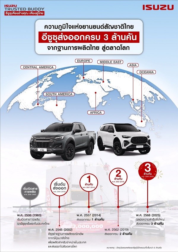 อีซูซุประกาศความสำเร็จครั้งประวัติศาสตร์ส่งท้ายปีด้วยยอดการส่งออกรถอีซูซุทั้งรถปิกอัพ “อีซูซุ ดีแมคซ์” และ รถยนต์นั่งอเนกประสงค์ “มิว-เอ็กซ์” จากฐานการผลิตในประเทศไทยไปสู่ตลาดโลก ครบ 3,000,000 คัน อย่างเป็นทางการ นับเป็นการยืนยันถึงคุณภาพมาตรฐานระดับโลก ตอกย้ำศักดิ์ศรี การเป็น “โปรดักแชมเปี้ยน” ที่สร้างมูลค่าทางเศรษฐกิจและภาพลักษณ์อันแข็งแกร่งให้ประเทศไทย ในตลาดโลก สะท้อนความเชื่อมั่นที่ลูกค้าทั่วโลกมีต่อผลิตภัณฑ์อีซูซุที่ผลิตจากฐานการผลิตในไทย