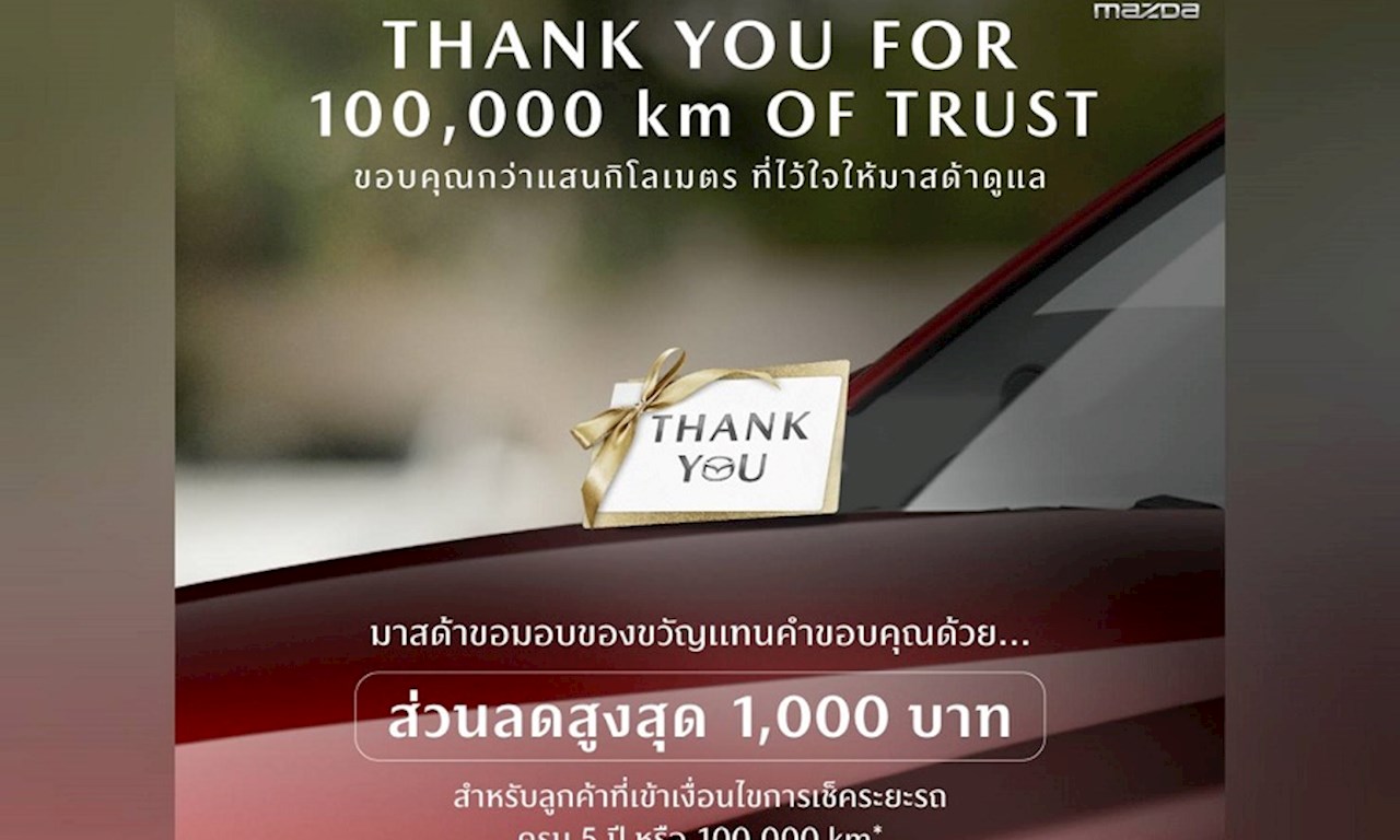 มาสด้า เซลส์ ประเทศไทย ส่งแคมเปญพิเศษ “THANK YOU FOR 100,000 km OF TRUST ขอบคุณกว่าแสนกิโลเมตรที่ไว้ใจให้มาสด้าดูแล” มอบคูปองส่วนลดสูงสุด 1,000 บาท ให้กับลูกค้ามาสด้าแฟมิลี่ เพื่อแทนคำขอบคุณที่ไว้ใจเข้าเช็กระยะกับศูนย์บริการตลอด 5 ปี หรือ 100,000 กม. ตอกย้ำถึงคำมั่นสัญญาจากมาสด้าที่ต้องการดูแลลูกค้าและรถยนต์ของลูกค้าไปตลอดอายุการใช้งาน สำหรับลูกค้าที่ได้สิทธิ์จะได้รับ SMS แจ้งทางมือถือที่ลงทะเบียนไว้กับศูนย์บริการ