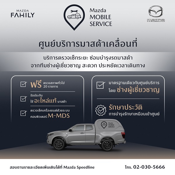 นอกจากนี้ มาสด้ายังได้ยกระดับประสบการณ์ด้านการบริการ ด้วย “MAZDA MOBILE SERVICE” หรือศูนย์บริการมาสด้าเคลื่อนที่ เพื่อเพิ่มความสะดวกให้กับลูกค้าในการเข้ารับบริการเช็กตามระยะและซ่อมบำรุงรักษา โดยทีมช่างเทคนิคผู้เชี่ยวชาญจากศูนย์บริการฯ จะเดินทางไปอำนวยความสะดวกและให้บริการตรวจเช็กระยะในพื้นที่หรือจังหวัดที่ลูกค้าต้องเดินทางไกลหรือไม่สะดวกเดินทาง ซึ่งลูกค้าสามารถติดตามข่าวสารได้จากโชว์รูมมาสด้าในพื้นที่หรือในจังหวัดใกล้เคียง เพื่อทำนัดหมายเพื่อเข้ารับบริการ ทั้งนี้ ลูกค้าที่เข้ารับบริการจากศูนย์บริการมาสด้าเคลื่อนที่จะได้รับการบริการตรวจเช็กสภาพทั่วไป ฟรี 20 รายการ ตรวจเช็กเครื่องยนต์ด้วยระบบคอมพิวเตอร์ M-MDS รับประกันอะไหล่แท้จากมาสด้า โดยลงประวัติการบำรุงรักษาเช่นเดียวกับการเข้าศูนย์บริการตามปกติ