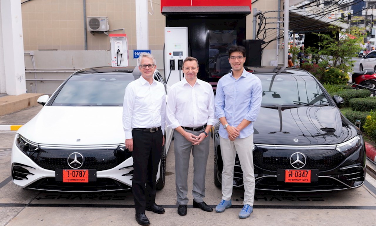 มร. มาร์ทิน ชเวงค์ ประธานบริหาร บริษัท เมอร์เซเดส-เบนซ์ (ประเทศไทย) จำกัด และ มร. บีเยิร์น กุซเทรา รองประธานบริหารฝ่ายขายและการตลาด บริษัท เมอร์เซเดส-เบนซ์ (ประเทศไทย) จำกัด ถ่ายภาพร่วมกับ นายพีระภัทร ศิริจันทโรภาส กรรมการผู้จัดการ บริษัท ชาร์จ แมเนจเม้นท์ จำกัด (SHARGE) ในโอกาสการทดสอบการขับขี่รถยนต์ไฟฟ้า 100% รุ่น EQS 500 4MATIC AMG Premium บนเส้นทางภูเก็ต-หัวหิน เพื่อร่วมแสดงเจตนารมณ์ในการส่งเสริมการใช้งานและยกระดับโครงสร้างพื้นฐานของรถยนต์พลังงานไฟฟ้า 100% (EV Infrastructure) ในประเทศไทย โดย SHARGE ถือเป็นพาร์ทเนอร์ของเมอร์เซเดส-เบนซ์ ที่เป็นผู้ติดตั้งเครื่องชาร์จไฟฟ้า Mercedes-Benz Wallbox ให้กับลูกค้าของเมอร์เซเดส-เบนซ์ เพื่อตอบโจทย์ความสะดวกสบายในการชาร์จรถยนต์ไฟฟ้าแก่ลูกค้าทุกคน