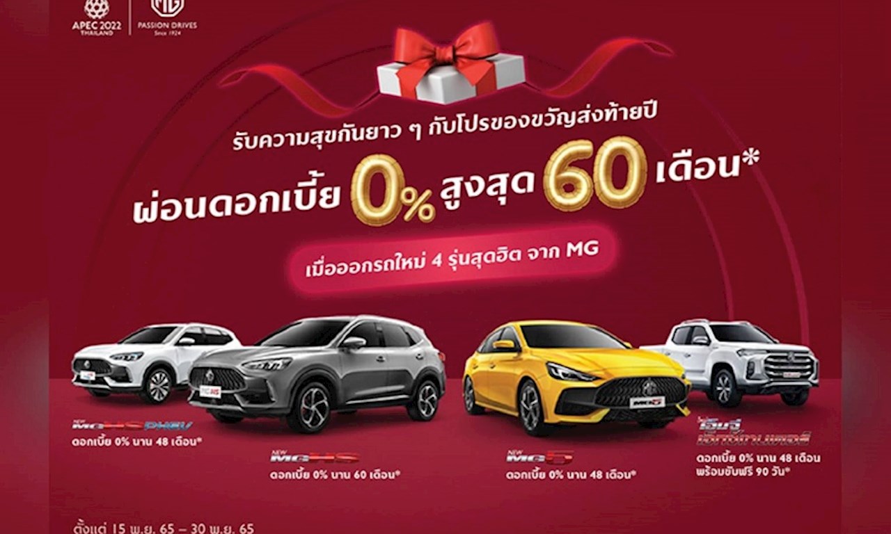 บริษัท เอสเอไอซี มอเตอร์ – ซีพี จำกัด และ บริษัท เอ็มจี เซลส์ (ประเทศไทย) จำกัด ผู้ผลิตและผู้จำหน่ายรถยนต์เอ็มจีในประเทศไทย เปิดโอกาสให้คนไทยได้เป็นเจ้าของรถยนต์เอ็มจีทุกรุ่นในราคาสุดคุ้ม ด้วยข้อเสนอพิเศษท้ายปี ไม่ว่าจะเป็น ดอกเบี้ยพิเศษ 0% ให้ใช้รถฟรี!! ก่อน 90 วัน รวมถึงผ่อนแบบสบายกระเป๋าเริ่มต้นเพียง 5,xxx บาทต่อเดือน พิเศษสำหรับผู้ที่จองและรับรถ เอ็มจี ภายในปี 2565 เท่านั้น