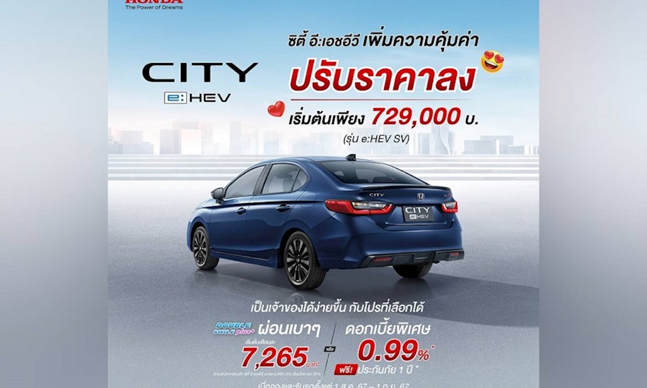 บริษัท ฮอนด้า ออโตโมบิล (ประเทศไทย) จำกัด ตอกย้ำความนิยมของตลาดxEV และกระแสตอบรับที่ดีจากลูกค้าชาวไทย มอบความคุ้มค่าในการเป็นเจ้าของยนตรกรรมฟูลไฮบริด e:HEV ได้ง่ายขึ้น ปรับราคาใหม่ สำหรับ ฮอนด้า ซิตี้ อี:เอชอีวี ลงทุกรุ่นย่อย โดยรุ่น e:HEV SV ราคา 729,000 บาท และรุ่น e:HEV RS 799,000 บาท ดีไซน์สปอร์ตพรีเมียมรอบคัน ภายในห้องโดยสารกว้างขวางสะดวกสบาย พร้อมฟังก์ชันการใช้งานที่รองรับไลฟ์สไตล์หลากหลายของคนยุคใหม่ มาพร้อมระบบฟูลไฮบริด e:HEV ผสานพลังขับเคลื่อนหลักจากมอเตอร์ไฟฟ้าทำงานร่วมกับเครื่องยนต์ มอบสมรรถนะการขับขี่ที่ทรงพลัง ให้ทั้งอัตราเร่งแรงเร้าใจ และอัตราการประหยัดน้ำมันที่ดีเยี่ยม พร้อมพาคุณเดินทางสู่ทุกจุดหมายและไปได้ไกลกว่า 800 กิโลเมตร ด้วยน้ำมันเพียง 1 ถัง* มั่นใจทุกการเดินทางด้วยเทคโนโลยีความปลอดภัยอัจฉริยะ Honda SENSING ที่มาพร้อมระบบปรับความเร็วตามรถยนต์คันหน้าที่ความเร็วต่ำ (with Low-Speed Follow: with LSF) เฉพาะรุ่น e:HEV SV และ e:HEV RS อีกทั้งหลากหลายเทคโนโลยีเพื่อความปลอดภัยและความสะดวกสบายในการขับขี่** อาทิ ระบบแสดงภาพมุมอับสายตาขณะเปลี่ยนเลน (Honda LaneWatch) ระบบล็อกรถอัตโนมัติเมื่อกุญแจรีโมทอยู่ห่างจากตัวรถ (Walk Away Auto Lock) ถุงลม 6 ตำแหน่ง ระบบเบรกมือไฟฟ้า (Electric Parking Brake) ระบบ Auto Brake Hold ไฟเตือนเบาะนั่งด้านหลัง (Rear Seat Reminder) ระบบเครื่องเสียงหน้าจอสัมผัสขนาด 8 นิ้ว แบบ Advanced Touch รองรับการเชื่อมต่อ Apple CarPlay และ Android Auto แบบไร้สาย ช่องเชื่อมต่อ USB ด้านหลังแบบ Type-C 2 ตำแหน่ง ระบบสตาร์ทเครื่องยนต์พร้อมเครื่องปรับอากาศด้วยกุญแจรีโมท (Remote Engine Start)