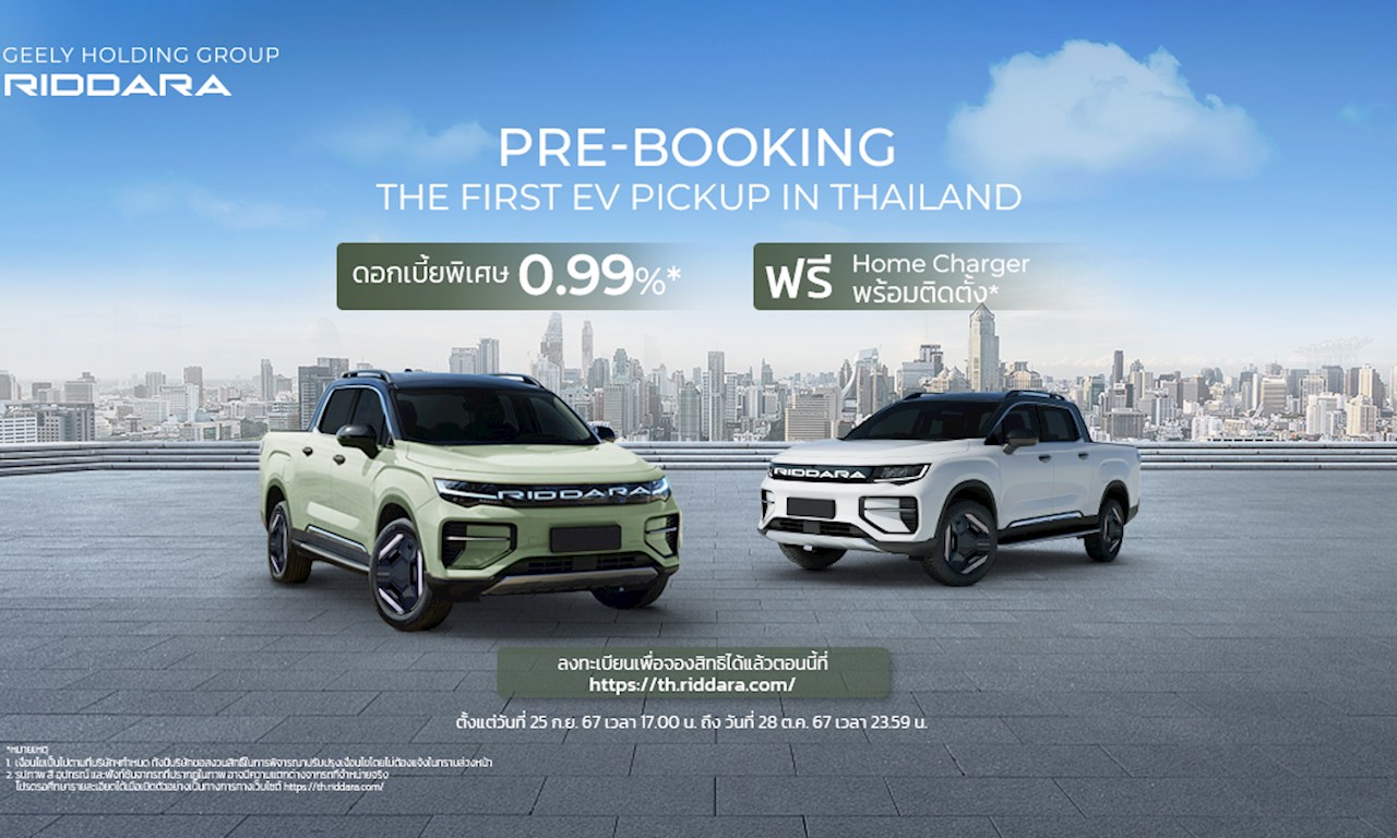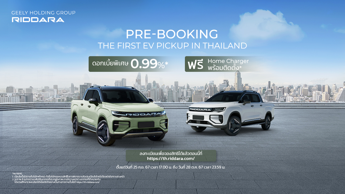 RIDDARA แบรนด์รถกระบะพลังงานไฟฟ้าในเครือ GEELY จัดแคมเปญ RIDDARA PRE-BOOKING เปิดให้จองสิทธิเป็นเจ้าของ RIDDARA ก่อนใคร จองวันนี้รับข้อเสนอสุดพิเศษทั้งดอกเบี้ย 0.99% และรับฟรี Home Charger พร้อมค่าบริการติดตั้ง สำหรับลูกค้า 1,000 ท่านแรกเท่านั้น ผู้ที่สนใจสามารถจองสิทธิได้ผ่านเว็บไซต์ https://th.riddara.com ตั้งแต่วันที่ 25 กันยายน 2567 ถึงวันที่ 28 ตุลาคม 2567 นี้