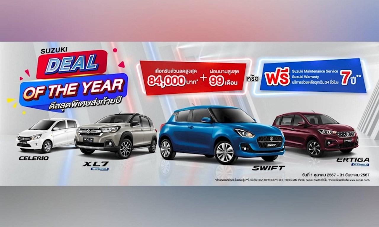 แคมเปญ “SUZUKI DEAL OF THE YEAR ดีลสุดพิเศษส่งท้ายปี” เริ่มตั้งแต่วันนี้ 1 ตุลาคม-31 ธันวาคม 2567 มีรายละเอียดดังนี้