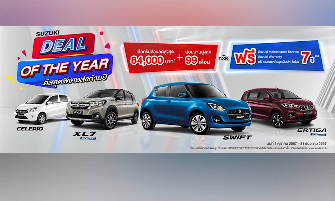 สำหรับลุกค้าที่สนใจอยากได้ทั้งผลิตภัณฑ์คุณภาพดีคุ้มค่าในราคาที่เหมาะสมมาพร้อมกับบริการที่ครบครัน จึงไม่อยากให้พลาดสิทธิพิเศษที่จะได้รับจากแคมเปญ “SUZUKI DEAL OF THE YEAR ดีลสุดพิเศษส่งท้ายปี” ซึ่งกำลังจะสิ้นสุดลงในวันที่ 31 ธันวาคม 2567 โดยมีรายละเอียดที่น่าสนใจ ดังนี้