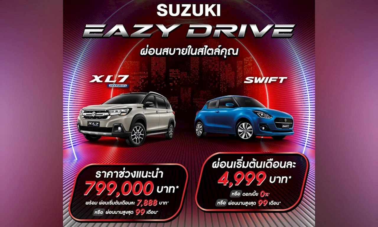 โดยในโอกาสพิเศษนี้เพื่อเป็นการขอบคุณลูกค้าทุกท่าน ซูซูกิได้ทำการขยายเวลาการมอบแคมเปญสุดพิเศษ โดยมอบข้อเสนอที่ดีที่สุดและคุ้มค่าที่สุด ให้แก่ผู้ที่ต้องการเป็นเจ้าของผลิตภัณฑ์จากซูซูกิ ให้สามารถเข้าถึงและตัดสินใจได้ง่ายมากยิ่งขึ้น กับแคมเปญ “SUZUKI EAZY DRIVE ผ่อนสบายในสไตล์คุณ” ให้ลูกค้าสามารถเลือกรับข้อเสนอสุดคุ้ม ผ่อนง่าย จ่ายสบาย มากกว่าที่เคย โดยสามารถเลือกรับดอกเบี้ย 0% ผ่อนนานสูงสุด 99 เดือน เริ่มต้นเพียงเดือนละ 2,999 บาท พร้อมฟรีประกันภัยชั้นหนึ่ง โดยแคมเปญ “SUZUKI EAZY DRIVE ผ่อนสบายในสไตล์คุณ” เริ่มตั้งแต่วันที่ 1-31 กรกฎาคม 2567 ซึ่งมีรายละเอียด ดังนี้