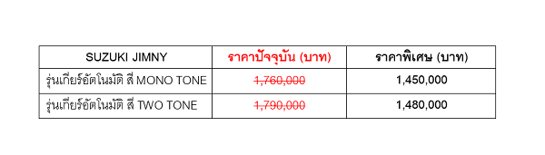 ทั้งนี้ ข้อเสนอพิเศษ “Legendary Deal of the Year” สำหรับ SUZUKI JIMNY มีจำนวนจำกัดเพียง 50 คันเท่านั้น โดยเป็นไปตามเงื่อนไขสีและรุ่นที่กำหนด บริษัทฯ ขอสงวนสิทธิ์ในการมอบข้อเสนอนี้จนกว่าสินค้าจะหมด ผู้สนใจสามารถติดต่อและสอบถามข้อมูลเพิ่มเติมได้ที่โชว์รูมผู้จำหน่ายรถยนต์ซูซูกิทั้ง 86 แห่งทั่วประเทศ ตั้งแต่วันนี้เป็นต้นไป