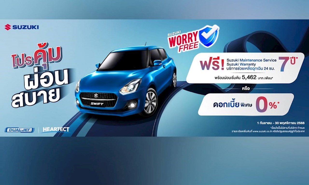 บริษัท ซูซูกิ มอเตอร์ (ประเทศไทย) จำกัด เผย "SUZUKI WORRY FREE PROGRAM" สร้างปรากฏการณ์ใหม่ตลาดรถยนต์นั่งขนาดเล็ก ไม่ใช่เพียงแค่โปรโมชัน แต่คือการมอบความคุ้มค่าและความมั่นใจที่เหนือกว่าแก่ผู้บริโภคชาวไทย ส่งผลให้ SUZUKI SWIFT ยังครองใจและมียอดขายอย่างต่อเนื่องทั่วประเทศ ตอกย้ำความคุ้มค่า ด้วยข้อเสนอพิเศษ ผ่อนเริ่มต้นเพียง 5,462 บาท หรือ ดอกเบี้ย 0% ตั้งแต่วันนี้ถึง 30 พฤศจิกายน 2568