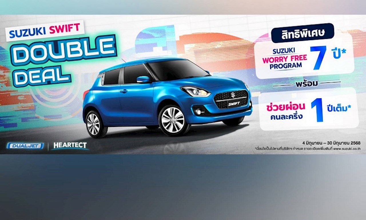 บริษัท ซูซูกิ มอเตอร์ (ประเทศไทย) จำกัด ชวนคุณมาเป็นเจ้าของ SUZUKI SWIFT สปอร์ตแฮทช์แบ็กอีโคคาร์รุ่นยอดนิยม พร้อมร่วมสัมผัสประสบการณ์แห่งความคุ้มค่า ด้วยแคมเปญสุดเร้าใจ "SUZUKI SWIFT DOUBLE DEAL" ตลอดเดือนมิถุนายน-สิงหาคม 2568 ที่จะทำให้การเป็นเจ้าของ SUZUKI SWIFT เป็นเรื่องง่ายและสบายใจยิ่งกว่าเคยSUZUKI SWIFT ยังคงเป็นตัวเลือกอันดับต้น ๆ สำหรับผู้ที่มองหารถยนต์ที่ครบครัน ทั้งด้านดีไซน์ที่โฉบเฉี่ยว ทันสมัย ประหยัดน้ำมันเป็นเลิศ และสมรรถนะการขับขี่ที่สนุกสนาน ตอบโจทย์การใช้งานในเมืองและเดินทางไกลได้อย่างลงตัว ด้วยความมุ่งมั่นที่จะส่งมอบความคุ้มค่าสูงสุดให้แก่ลูกค้า ซูซูกิจึงจัดเต็มด้วยข้อเสนอที่พลาดไม่ได้ แคมเปญ "SUZUKI SWIFT DOUBLE DEAL" มาพร้อมความคุ้มค่าที่มอบให้คุณมากกว่าใคร ดังนี้