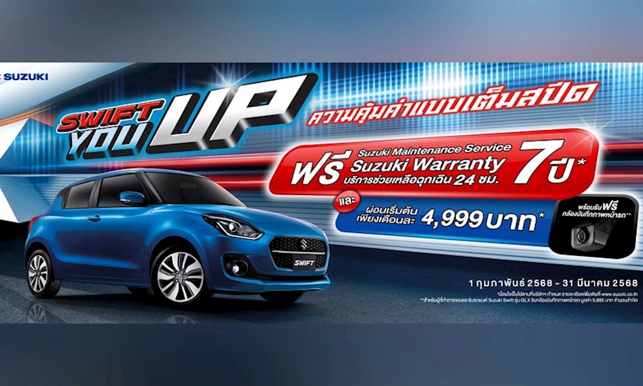 พิเศษ !สำหรับลูกค้าที่สนใจเป็นเจ้าของ SUZUKI SWIFT เรายังได้ขยายโปรโมชันพิเศษ SWIFT 777 ฟรี! ค่าบำรุงรักษารถรวมค่าแรง 7 ปี ฟรี !การรับประกันคุณภาพรถยนต์ 7 ปี และ ฟรี บริการช่วยเหลือฉุกเฉิน 7 ปี มูลค่ามากกว่า 50,000 บาท หรือ เลือกรับส่วนลดอุปกรณ์ตกแต่งมูลค่ารวมสูงสุด 50,000 บาท สำหรับรุ่น GL และ GLX หรือ รับส่วนลดอุปกรณ์ตกแต่งมูลค่ารวมสูงสุด 45,000 บาท สำหรับรุ่น GL NEXT มอบให้แก่ลูกค้าที่จองและรับรถตั้งแต่วันที่ 1 กุมภาพันธ์ - 31 มีนาคม 2568