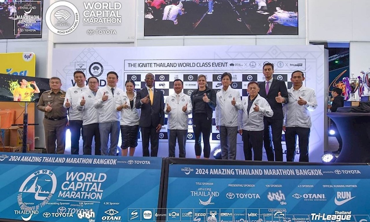 กระทรวงการท่องเที่ยวและกีฬา การท่องเที่ยวแห่งประเทศไทย กรุงเทพมหานคร สมาคมกรีฑาโลก การกีฬาแห่งประเทศไทย และไทยแลนด์ไตรลีก แถลงข่าวความพร้อมการจัดการแข่งขันวิ่งมาราธอนส่งเสริมการท่องเที่ยว “วิ่งผ่าเมือง ครั้งที่ 7” รายการ อะเมซิ่งไทยแลนด์มาราธอนแบงค็อก 2024 พรีเซ็นต์บายโตโยต้า ชิงถ้วยพระราชทานพระบาทสมเด็จพระเจ้าอยู่หัว สมเด็จพระนางเจ้าฯ พระบรมราชินี และสมเด็จพระเจ้าลูกเธอ เจ้าฟ้าพัชรกิติยาภาฯ ชิงเงินรางวัลรวม 2,440,500 บาท โดยปีนี้ กำหนดจัดงานในวันอาทิตย์ที่ 1 ธ.ค.67 เวลา 02.00-09.30 น. มีนักวิ่งจาก 77 ประเทศทั่วโลก แห่สมัครร่วมแข่งขันมากเป็นประวัติการณ์ 3.3 หมื่นคน ด้านรมว.ท่องเที่ยว ควงผู้ว่าททท. ทำเซอร์ไพรส์ประกาศคว้ายอดนักวิ่งมาราธอนชื่อก้องโลก เอเลียด คิปโชเก้ มาเป็นทูตการท่องเที่ยวและกีฬา และร่วมวิ่งในงาน คาดนักวิ่งประชาชนทั่วไปจะมาร่วมต้อนรับหลายหมื่นคน