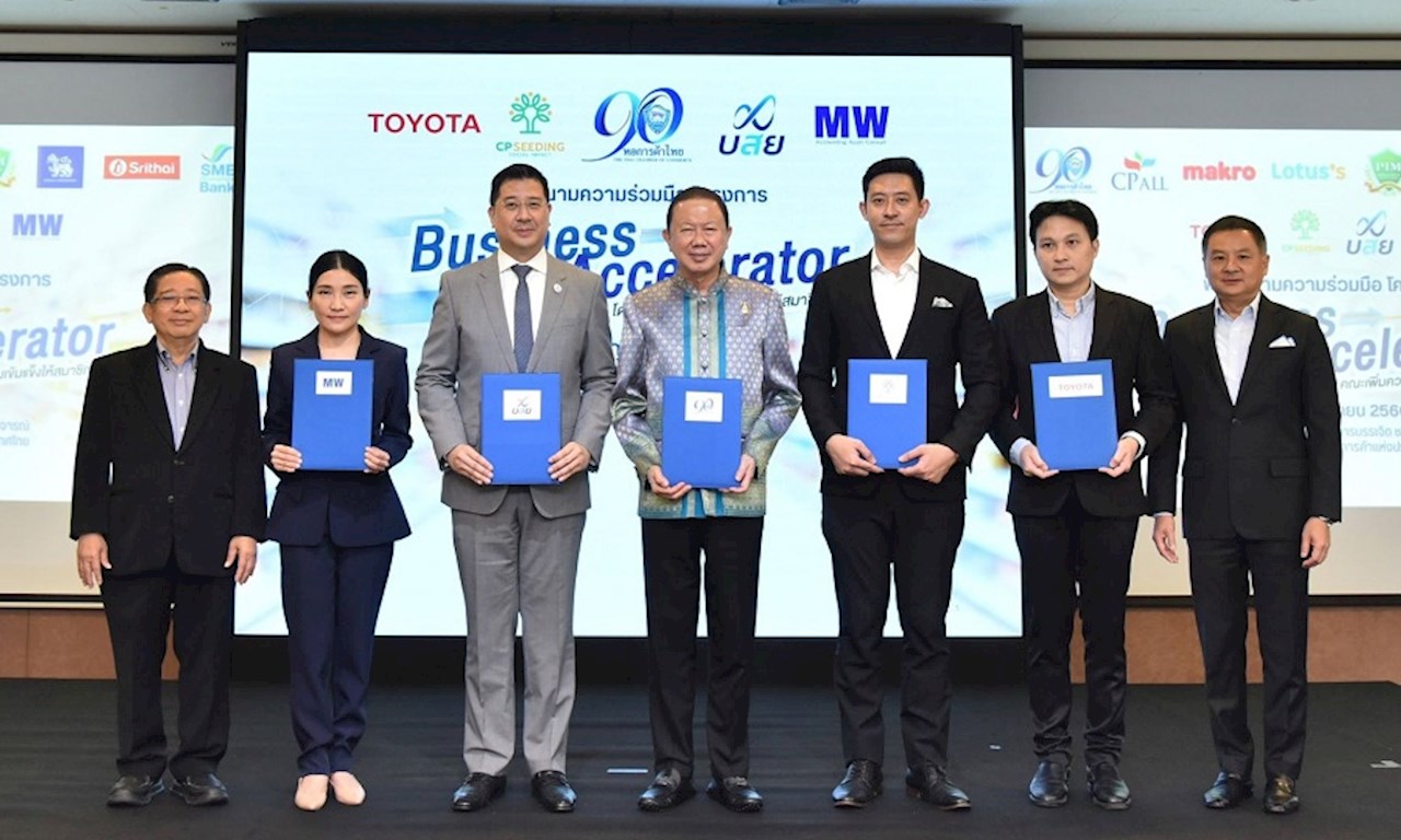 นายนันทวัฒน์ ศรีวรัตน์อัชกุล ผู้ช่วยกรรมการผู้จัดการใหญ่ บริษัท โตโยต้า มอเตอร์ ประเทศไทย จำกัด พร้อมด้วย นายสนั่น อังอุบลกุล ประธานกรรมการหอการค้าไทย และสภาหอการค้าแห่งประเทศไทย นายพลิษศร์ ภิรมย์ภักดี รองประธานกรรมการหอการค้าไทย และประธานคณะกรรมการเพิ่มความเข้มแข็งให้สมาชิก นายปิยะวัฒน์ ฐิตะสัทธาวรกุล กรรมการบริหารหอการค้าไทย และรองประธานกรรมการบริหาร บริษัท ซีพี ออลล์ จํากัด (มหาชน) ร่วมลงนามบันทึกข้อตกลงความร่วมมือโครงการ “Business Accelerator” ระหว่าง หอการค้าไทย และ 4 บริษัทพันธมิตร ร่วมพัฒนาศักยภาพ ถ่ายทอดองค์ความรู้ และประสบการณ์ทางธุรกิจ เพื่อเตรียมความพร้อมผู้ประกอบการ SMEs สู่ช่องทางขายกับ Modern trade เมื่อวันที่ 6 มิถุนายน ที่ผ่านมา ณ สภาหอการค้าไทย