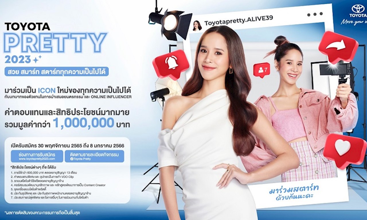 บริษัท โตโยต้า มอเตอร์ ประเทศไทย จำกัด ประกาศรับสมัครสาวสวยมากความสามารถมาร่วมเป็น ICON ใหม่ของทุกความเป็นไปได้ กับบทบาทของตัวแทนในการนำเสนอยนตรกรรม และ ONLINE INFLUENCER ในนาม TOYOTA PRETTY 2023 รับค่าตอบแทน และสิทธิประโยชน์มากมายกว่า 1,000,000 บาท เปิดรับสมัครแล้ววันนี้ผ่านช่องทางออนไลน์ www.toyotapretty2023.com หมดเขตรับสมัคร 8 มกราคม 2566 เพียงคุณมีคุณสมบัติดังต่อไปนี้