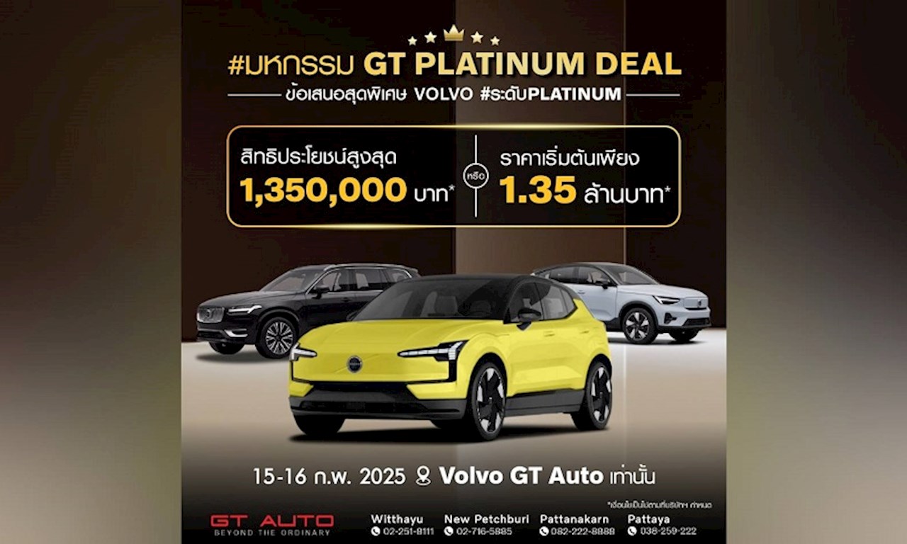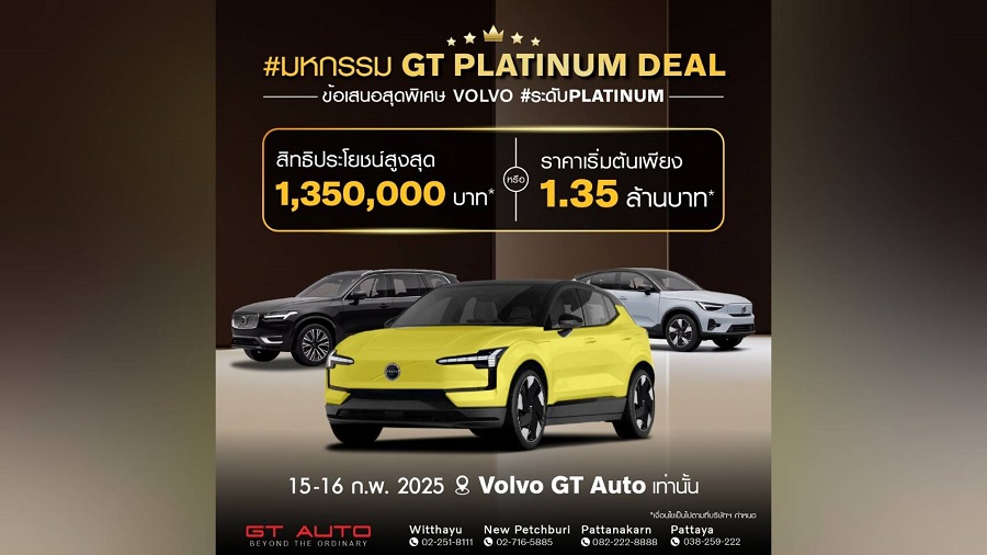 นอกจากนี้เพื่อเป็นการฉลองเปิดโชว์รูม และศูนย์บริการแบบชั่วคราวสาขาพัฒนาการ GT Auto จัดงานแจกแคมเปญพิเศษ #มหกรรม GT Platinum Deal…ข้อเสนอ Volvo สุดพิเศษ #ระดับPLATINUM สำหรับรถยนต์ Volvo ทุกรุ่น ทั้งรุ่น Plug-In Hybrid และ Pure Electric (รถยนต์ไฟฟ้า 100%) มอบสิทธิประโยชน์สูงสุด 1,350,000 บาท หรือ Volvo EX30 ราคาเริ่มต้นเพียง 1.35 ล้านบาท ในวันที่ 15-16 ก.พ. นี้ ที่ วอลโว่ GT Auto ทุกสาขา พร้อมข้อเสนอพิเศษอื่น ๆ อีกมากมาย เช่น