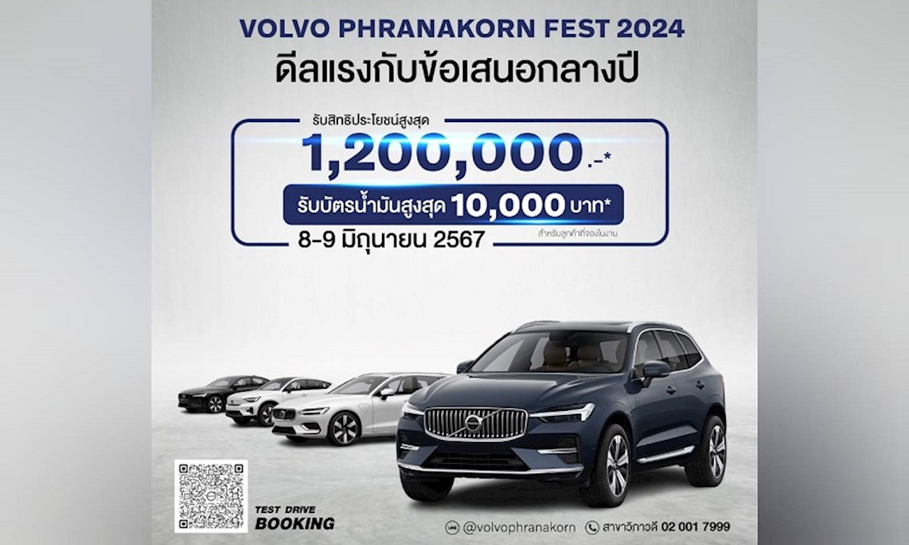 บริษัท พระนคร สวีดิช คาร์ จำกัด หนึ่งในผู้แทนจำหน่ายรถยนต์วอลโว่อย่างเป็นทางการในประเทศไทย ผู้ให้บริการครบคลุม ทั้งงานขาย และงานให้บริการหลังการขาย แบบ One Stop Service จัดงานมหกรรมสุดพิเศษ Mid-Year Bonus 2024 เปิดดีลแรงกับข้อเสนอกลางปี 8-9 มิถุนายน 2567 นี้ Volvo Phranakorn Fest 2024 ครั้งที่ 4 ซึ่งเป็นผลต่อเนื่องจากกระแสการตอบรับที่ดีของการจัดงานก่อนหน้านี้ โดยงานครั้งนี้ได้นำรถยนต์วอลโว่ผู้บริหารป้ายแดง เลขไมล์น้อย ที่ได้รับการการันตีคุณภาพกว่า 30 คัน ยกขบวนมาให้เลือกซื้อแบบได้สัมผัสคันจริงกันในงาน พร้อมด้วยสิทธิพิเศษสูงสุดถึง 1,200,000 บาท
