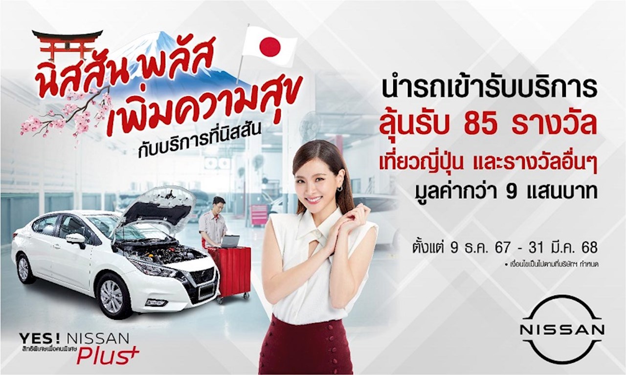 นิสสัน มอบความสุขส่งท้ายปีเก่าต้อนรับปีใหม่ เปิดตัวแคมเปญ “YES! NISSAN Plus Campaign นิสสัน พลัสเพิ่มความสุข กับบริการที่นิสสัน” ชวนลูกค้านำรถเข้ารับบริการที่ศูนย์บริการนิสสัน พร้อมลุ้นรับรางวัลแพ็กเกจทริปเที่ยวญี่ปุ่นสุดประทับใจ หรือส่วนลดพิเศษมากมายเมื่อนำรถเข้ารับบริการที่ศูนย์บริการนิสสันทั่วประเทศ รวม 85 รางวัล มูลค่ารวมกว่า 9 แสนบาท ตั้งแต่ 9 ธันวาคม 2567 ถึง 31 มีนาคม 2568