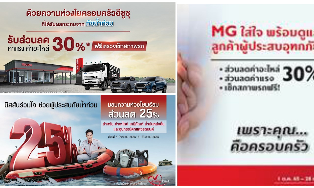 ผู้ประกอบการรถยนต์หลายค่ายจัดแคมเปญช่วยเหลือลูกค้าผู้ประสบภัยน้ำท่วม อีซูซุ มอบส่วนลด 30% สำหรับค่าบริการหลังการขาย เอ็มจี เช็ครถฟรี พร้อมมอบส่วนลด 30% ค่าอะไหล่และค่าแรง