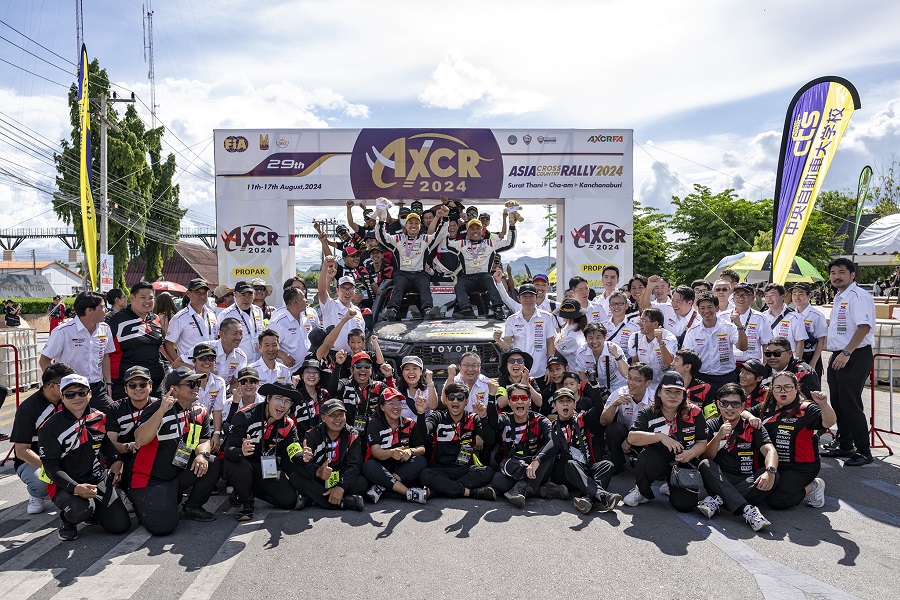 TOYOTA GAZOO Racing Thailand ส่งรถ Hilux REVO GR SPORT Wide Tread 3 คัน ลงการแข่งขัน “Asia Cross Country Rally 2024” เพื่อพิสูจน์สมรรถนะของทั้งรถและคน เพราะในสภาวะกดดันของการแข่งขันจะช่วยเค้นศักยภาพทั้งหมดออกมาเพื่อมุ่งสู่เส้นชัย TOYOTA GAZOO Racing Thailand ร่วมกับวิศวกรชาวไทย (TMA) ในการศึกษาเก็บข้อมูลเพื่อนำไปพัฒนายนตรกรรมที่ดียิ่งกว่าให้กับผู้ใช้รถคนไทยในอนาคต ตามแนวคิด MAKE EVER-BETTER CARS FROM CIRCUIT TO THE ROAD หลังพิธีตีธงเปิดการแข่งขันในวันที่ 11 สิงหาคม ณ หอนาฬิกาใจกลางเมืองจังหวัดสุราษฎร์ธานี เช้าวันที่ 12 สิงหาคม ก็เป็นการสตาร์ทออกตัวของ Leg1 จ.สุราษฎร์ธานี และต่อเนื่องจนถึง Leg6 จ.กาญจนบุรี ต้องผ่านเส้นทางที่ยากลำบาก ทั้งทางที่เป็นหลุมบ่อขนาดใหญ่ เต็มไปด้วยก้อนหินตะปุ่มตะป่ำ ทางแคบขับยาก มีร่องน้ำลึกข้างทาง และมีเงาป่ายางที่ทำให้ทัศนวิสัยลดลง ทั้งนักขับและ Co-Driver ต้องใช้ประสบการณ์ในการสังเกตจุดมาร์คต่างๆ เป็นอย่างดี และมีทางขึ้นลงเขาที่มีฝนตกหนัก ทำให้ค่อนข้างลื่น ขับยาก บางวันเจอกับป่าหิน ร่องน้ำและทางขาด รถทั้ง 3 คัน และทีมงานเบื้องหลังต้องปรับแผนปรับรถสู้เต็มที่ในทุกวัน จบการแข่งขันทั้ง 6 วันไปด้วยชัยชนะยิ่งใหญ่คุ้มค่าการรอคอย เมื่อรถหมายเลข 105 Class T1D ขับโดย มานะ พรศิริเชิด และกิติศักดิ์ กลิ่นจันทร์ (Co-Driver) จบการแข่งขันคว้าแชมป์อันดับ 1 ของรุ่นและแบบโอเวอร์ออล ใช้เวลารวม 14:22 ชม.