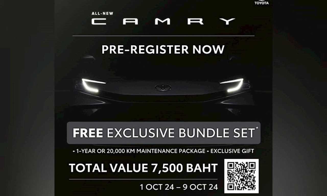 บริษัท โตโยต้า มอเตอร์ ประเทศไทย จำกัด เปิดรับลงทะเบียนจองสิทธิ์ก่อนการเปิดตัวอย่างเป็นทางการ สำหรับผู้ที่สนใจเป็นเจ้าของซีดานขนาดกลางระดับหรู รุ่นใหม่ล่าสุดจากโตโยต้า กับกิจกรรม ALL-NEW CAMRY Exclusive Pre-register โดยสามารถลงทะเบียนผ่านช่องทางออนไลน์ที่ www.toyota.co.th/exclusivepreregister/camry หรือติดต่อโชว์รูมผู้แทนจำหน่ายโตโยต้า ตั้งแต่วันที่ 1 - 9 ตุลาคม พ.ศ. 2567