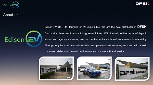 นางสาวธันย์จิรา ภูริชพุฒิพันธ์ ผู้จัดการทั่วไป บริษัท เอดิสัน อีวี จำกัด กล่าวว่า "Edison EV ก่อตั้งเมื่อ 28 มิถุนายน 2567 โดยได้รับการแต่งตั้งเป็นผู้จัดจำหน่ายแต่เพียงผู้เดียวของรถยนต์ไฟฟ้าแบรนด์ DFSK ในไทย ภายใต้การสนับสนุนจาก SERES Group ผู้ผลิตรถยนต์ไฟฟ้าชั้นนำของจีน ผ่าน DFSK (Chongqing Sokon Motor (Group) Import & Export Co., Ltd.) "