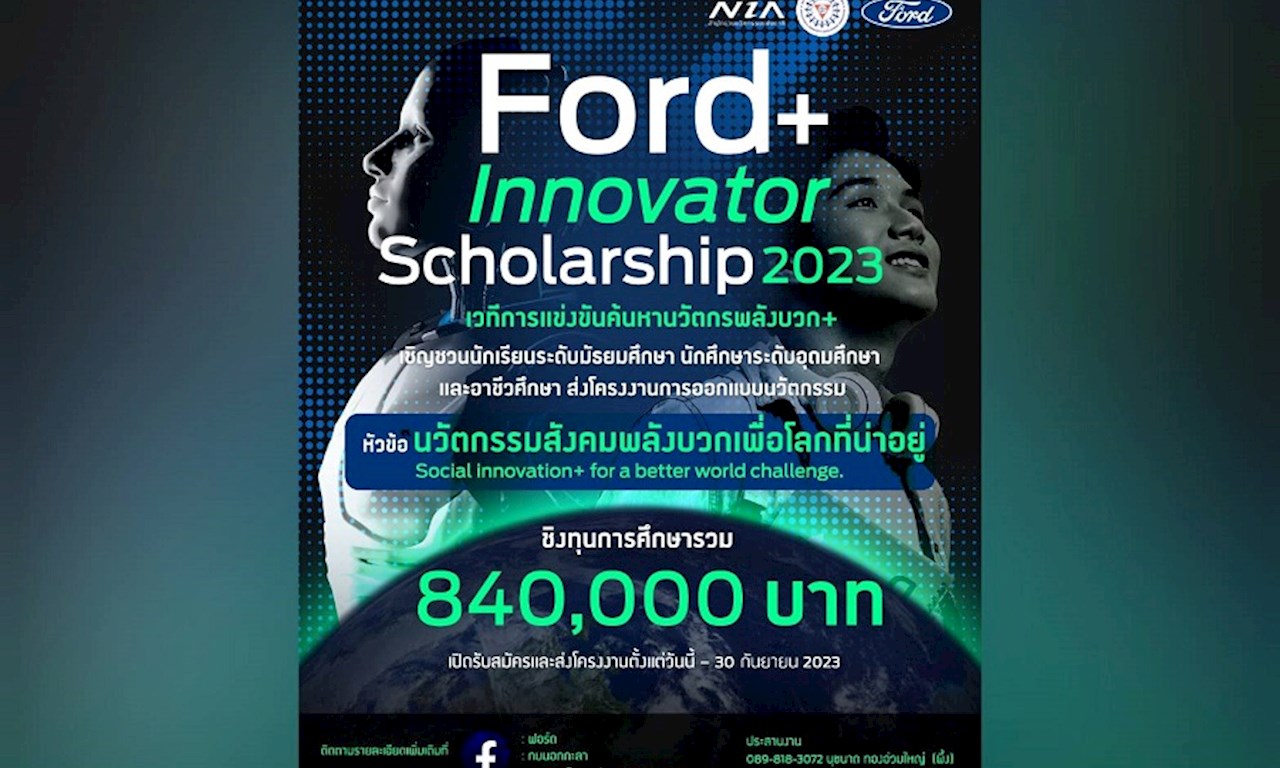 ฟอร์ด ประเทศไทย ร่วมกับสมาคมพัฒนาประชากรและชุมชน (Population and Community Development Association - PDA) สำนักงานนวัตกรรมแห่งชาติ (National Innovation Agency - NIA) และบริษัท ทีวีบูรพา จำกัด จัดโครงการ Ford+ Innovator Scholarship 2023 ต่อเนื่องเป็นปีที่ 9 เปิดพื้นที่ให้เยาวชนร่วมประชันไอเดียนวัตกรรมและการออกแบบสิ่งประดิษฐ์ ในหัวข้อ นวัตกรรมทางสังคมพลังบวกเพื่อยกระดับโลกให้น่าอยู่ (Social innovation+ for a better world challenge) ชิงทุนการศึกษาจำนวน 12 ทุน รวม 840,000 บาท นักเรียน นักศึกษาในระดับมัธยมศึกษา อาชีวศึกษา และอุดมศึกษาที่สนใจ สามารถสมัครเข้าร่วมโครงการและส่งผลงานได้ตั้งแต่วันที่ 15 สิงหาคม – 30 กันยายน 2566