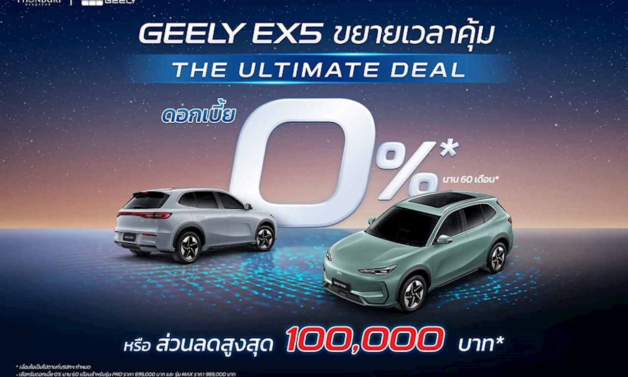 เพื่อตอบรับกระแสตอบรับอันดีเยี่ยมจากลูกค้าทั่วประเทศ บริษัทฯ ได้ขยายระยะเวลาแคมเปญ “The Ultimate Deal” สำหรับรถยนต์ GEELY EX5 รถอเนกประสงค์พลังงานไฟฟ้า 100% ไปจนถึงวันที่ 31 สิงหาคม 2568 โดยยังคงมอบสิทธิประโยชน์และข้อเสนอพิเศษเช่นเดิม