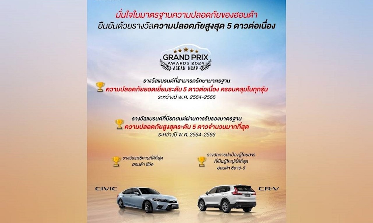 บริษัท ฮอนด้า ออโตโมบิล (ประเทศไทย) จำกัด ให้ความสำคัญกับความปลอดภัยบนท้องถนนและการส่งมอบยนตรกรรมคุณภาพที่มาพร้อมความปลอดภัยสูงสุดแก่ลูกค้า ตอกย้ำความมั่นใจในมาตรฐานความปลอดภัยของรถยนต์ฮอนด้า ด้วยการคว้า 4 รางวัลด้านความปลอดภัย จาก ASEAN NCAP Grand Prix Awards 2024 นำโดย 2 รางวัล Excellence Award ในฐานะแบรนด์ที่สามารถรักษามาตรฐานความปลอดภัยยอดเยี่ยมระดับ 5 ดาวต่อเนื่องครอบคลุมในทุกรุ่น ระหว่างปี พ.ศ. 2564-2566 (Consistent 5-Star Ratings Across All Models 2021-2023) และเป็นแบรนด์ที่มีรถยนต์ผ่านการรับรองมาตรฐานความปลอดภัยสูงสุดระดับ 5 ดาวจำนวนมากที่สุด ระหว่างปี พ.ศ. 2564-2566 (Most 5-Star Ratings 2021-2023) พร้อมกันนี้ ฮอนด้า ซีอาร์-วี ยังได้รับรางวัลการปกป้องผู้โดยสารที่เป็นผู้ใหญ่ที่ดีที่สุด (Best Safety Performance in Adult Occupant Protection: AOP) และฮอนด้า ซีวิค ได้รับรางวัล Excellence Award ในการเป็นรถซีดานที่ดีที่สุด โดยความสำเร็จครั้งนี้สะท้อนถึงความมุ่งมั่นในการส่งมอบยนตรกรรมคุณภาพที่มาพร้อมเทคโนโลยีความปลอดภัยอันล้ำสมัย อีกทั้งตอกย้ำความมุ่งมั่นในการยกระดับความปลอดภัยของยานพาหนะในภูมิภาคอาเซียนไปอีกขั้น สอดคล้องกับเป้าหมายของฮอนด้าในการสร้างสังคมปลอดอุบัติเหตุ และลดการเสียชีวิตที่เกี่ยวข้องกับรถยนต์และรถจักรยานยนต์ฮอนด้าทั่วโลกให้เป็นศูนย์ (Zero Traffic Collision Fatalities) ให้เกิดขึ้นอย่างยั่งยืน ภายในปี พ.ศ. 2593 (Honda Target 2050)