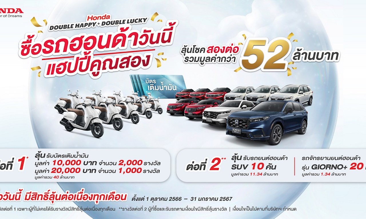 บริษัท ฮอนด้า ออโตโมบิล (ประเทศไทย) จำกัด จัดโปรใหญ่ มอบความสุขส่งท้ายปีด้วย แคมเปญ “Honda Double Happy, Double Lucky ซื้อรถฮอนด้าวันนี้ แฮปปี้คูณสอง” ให้ลูกค้าที่ซื้อและรับรถยนต์ฮอนด้ารุ่นใดก็ได้ ตั้งแต่วันที่ 1 ตุลาคม 2566 – 31 มกราคม 2567 โดยลูกค้าจะได้รับ 1 สิทธิ์ต่อการซื้อรถยนต์ 1 คัน เพื่อลุ้นรับรางวัล 2 ต่อ ยิ่งซื้อรถเร็ว ยิ่งมีสิทธิ์ลุ้นต่อเนื่องมากกว่า โดยต่อที่ 1 ลุ้นรับบัตรน้ำมันมูลค่า 20,000 บาท หรือ 10,000 บาท โดยมีจำนวนเพิ่มขึ้นในทุกเดือน รวม 3,000 รางวัล หากคุณยังไม่ได้รับโชคในครั้งแรก คุณจะสามารถลุ้นได้ใหม่ทุกเดือนตลอดแคมเปญ และต่อที่ 2 ลูกค้าทุกคนมีสิทธิ์ลุ้นรางวัลใหญ่ รวม 30 รางวัล ได้แก่ รถยนต์ฮอนด้าในไลน์อัปเอสยูวี 4 รุ่น จำนวน 10 คัน และรถจักรยานยนต์ ฮอนด้า จีออโน่ พลัส (GIORNO+) รุ่น ABS จำนวน 20 คัน รวมรางวัลทั้งสิ้น 3,030 รางวัล มูลค่ากว่า 52 ล้านบาท