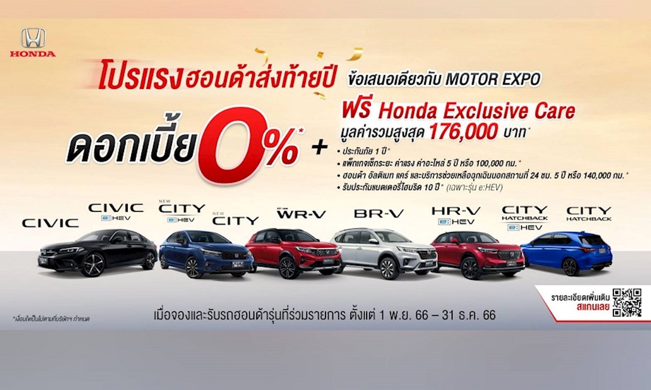 บริษัท ฮอนด้า ออโตโมบิล (ประเทศไทย) จำกัด จัดโปรโมชันพิเศษต้อนรับเทศกาลส่งความสุขส่งท้ายปี เพื่อให้ลูกค้าเป็นเจ้าของรถยนต์ฮอนด้าได้ง่ายขึ้น กับแคมเปญสุดพิเศษ “โปรแรงฮอนด้าส่งท้ายปี ข้อเสนอเดียวกับ Motor Expo” ด้วยข้อเสนอพิเศษที่แตกต่างกันไปในแต่ละรุ่น ได้แก่ ดอกเบี้ยเริ่มต้น 0% หรือฮอนด้าช่วยผ่อน นาน 12 เดือน รวมมูลค่าสูงสุดถึง 54,000 บาท พร้อมรับ ฮอนด้า เอ็กซ์คลูซีฟ แคร์ (Honda Exclusive Care) ประกอบด้วย ฟรีประกันภัย 1 ปี พร้อมแพ็กเกจเช็กระยะ ค่าแรง ค่าอะไหล่ 5 ปี หรือ 100,000 กม. และฟรี Honda Ultimate Care (ฮอนด้า อัลติเมท แคร์) โปรแกรมการให้บริการพิเศษด้านคุณภาพรถยนต์ ขยายการรับประกันคุณภาพรถยนต์ใหม่และบริการช่วยเหลือฉุกเฉินบนท้องถนน 24 ชั่วโมง เพิ่มอีก 2 ปี หรือ 40,000 กิโลเมตร ต่อจากการรับประกันคุณภาพรถใหม่ 3 ปี หรือ 100,000 กิโลเมตร รวมเป็น 5 ปี หรือ 140,000 กิโลเมตร (อย่างใดอย่างหนึ่งถึงก่อน) พิเศษ สำหรับไลน์อัป อี:เอชอีวี รวมการรับประกันอายุการใช้งานแบตเตอรี่ไฮบริดถึง 10 ปี และรับประกันระบบไฮบริดทั้งระบบ 5 ปี ไม่จำกัดระยะทาง หรือทางเลือกพิเศษ Double Smile Plus สินเชื่อใหม่จาก ฮอนด้า ลีสซิ่ง ที่จะช่วยให้การออกรถยนต์ฮอนด้าคันใหม่ของคุณเป็นเรื่องง่ายๆ สบาย ๆ ดาวน์เริ่มต้นเพียง 5% พร้อมฟรีประกันภัย 1 ปี เฉพาะรุ่นที่ร่วมรายการ สำหรับลูกค้าที่จองและรับรถยนต์ฮอนด้ารุ่นที่ร่วมรายการตั้งแต่วันที่ 1 พฤศจิกายน 2566 – 31 ธันวาคม 2566