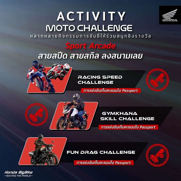 - Racing Speed Challenge แข่งขันทางเรียบด้วยรถ Honda NSF100 (รถจาก Thai Honda) คูปอง 1 ใบ ลงแข่งได้ 1 ครั้ง แข่งขันทั้งหมด 5 รอบสนาม/ครั้ง ผู้ที่ทำเวลารวมได้เร็วที่สุด 3 อันดับ จะได้รับเงินรางวัล และของรางวัล โดยเก็บคะแนนใน Honda Passport