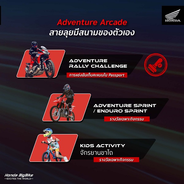 โซน Adventure Arcade สำหรับผู้ที่ชื่นชอบการขับขี่สไตล์แอดเวนเจอร์ เปิดโอกาสให้ผู้ขับขี่ใช้รถจักรยานยนต์ส่วนตัวเข้าร่วมสนุก 2 กิจกรรมหลัก ได้แก่