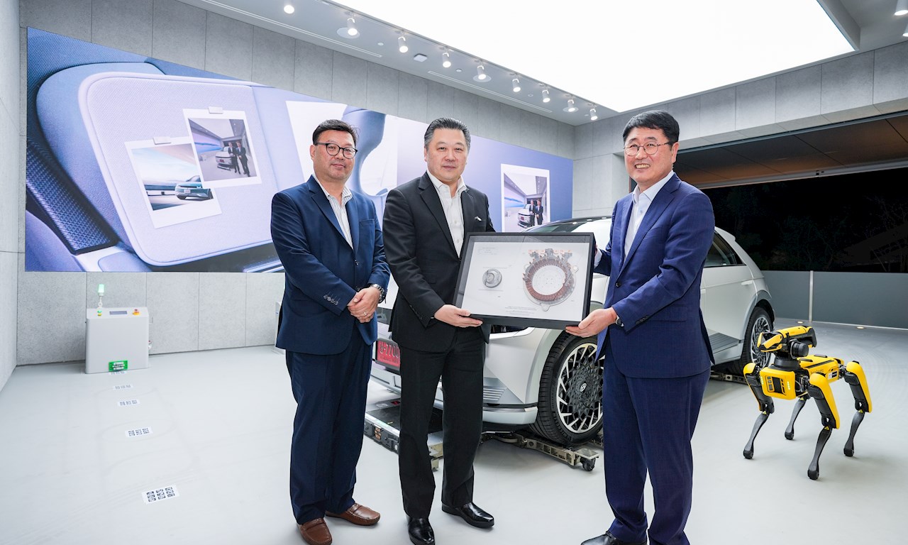 นายเจ กิว จอง ประธานเจ้าหน้าที่บริหาร บริษัท ฮุนได โมบิลิตี้ (ประเทศไทย) จำกัด พร้อมด้วย นายยัง ตัก ลี รองประธาน บริษัท ฮุนได มอเตอร์ จำกัด มอบของที่ระลึกให้กับ นายสุภกิต เจียรวนนท์ ประธานกรรมการ บริษัท เจริญโภคภัณฑ์อาหาร จำกัด (มหาชน) ในพิธีส่งมอบรถยนต์ IONIQ 5 ให้กับลูกค้าคนแรกของประเทศไทยที่ IONIQ Lab โชว์รูมซึ่งเต็มเปี่ยมไปด้วยนวัตกรรม ณ True Digital Park กรุงเทพฯ