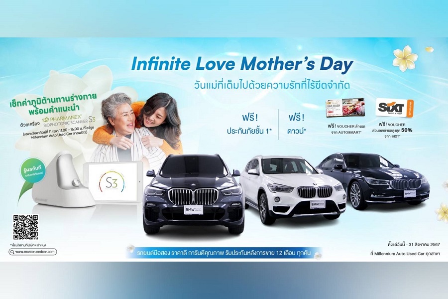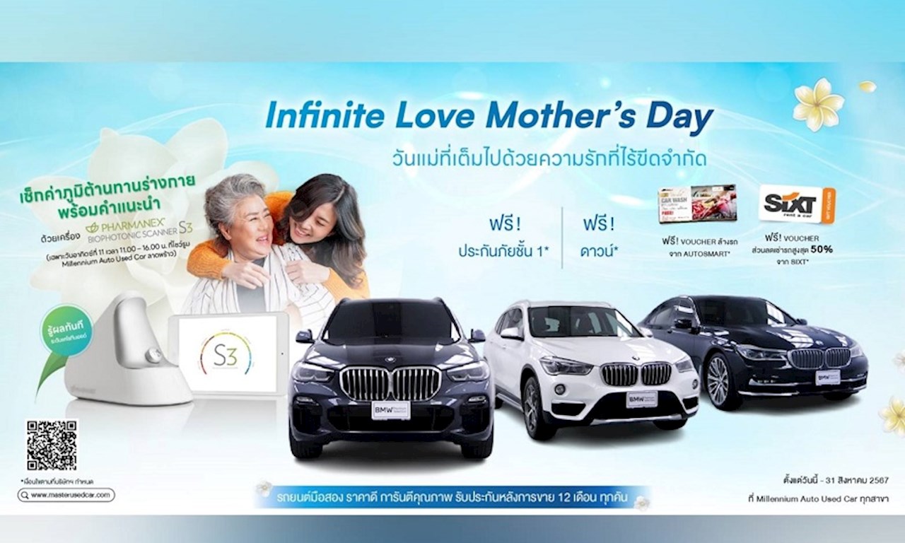 มาสเตอร์ เซอร์ทิฟายด์ ยูสคาร์ ต้อนรับเดือนแห่งวันแม่ มอบโปรฯ ความรักที่ไร้ขีดจำกัด! ‘Infinite Love Mother’s Day’ เชิญคนสำคัญที่คุณรัก มาเช็กค่าภูมิต้านทานร่างกาย พร้อมคำแนะนำ ด้วยเครื่อง Biophotonic Scanner S3 ภายใต้มาตรฐานเหนือระดับ รู้ผลทันที ในวันที่ 11 สิงหาคม ที่โชว์รูม มิลเลนเนียม ออโต้ ยูสคาร์ ลาดพร้าว พร้อมเลือกสรรยนตรกรรมมือสอง รุ่นที่ชอบ คันที่ใช่ ในราคาสุดคุ้มได้ตลอดเดือนสิงหาคม 2567 ที่โชว์รูม มิลเลนเนียม ออโต้ ยูสคาร์ ทุกสาขา