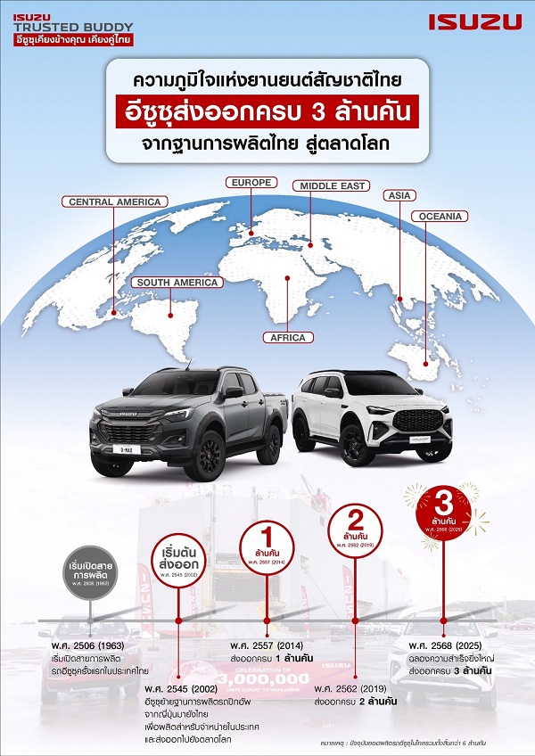 อีซูซุประกาศความสำเร็จครั้งประวัติศาสตร์ส่งท้ายปีด้วยยอดการส่งออกรถอีซูซุทั้งรถปิกอัพ “อีซูซุ ดีแมคซ์” และ รถยนต์นั่งอเนกประสงค์ “มิว-เอ็กซ์” จากฐานการผลิตในประเทศไทยไปสู่ตลาดโลก ครบ 3,000,000 คัน อย่างเป็นทางการ นับเป็นการยืนยันถึงคุณภาพมาตรฐานระดับโลก ตอกย้ำศักดิ์ศรี การเป็น “โปรดักแชมเปี้ยน” ที่สร้างมูลค่าทางเศรษฐกิจและภาพลักษณ์อันแข็งแกร่งให้ประเทศไทย ในตลาดโลก สะท้อนความเชื่อมั่นที่ลูกค้าทั่วโลกมีต่อผลิตภัณฑ์อีซูซุที่ผลิตจากฐานการผลิตในไทย