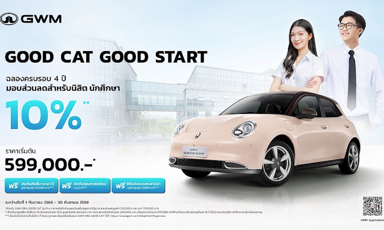 GWM (Thailand) ยกระดับสู่การเป็นแบรนด์รถยนต์ที่มีผลิตภัณฑ์ครอบคลุมทุกประเภทพลังงานที่ตอบสนองความต้องการของผู้ใช้งานทั่วทุกมุมโลก ด้วยแนวคิด “ครอบคลุมทุกการใช้งาน (All Scenarios) ด้วยผลิตภัณฑ์ที่ครอบคลุมทุกพลังงาน (All Powertrains) สู่การตอบสนองทุกกลุ่มผู้ใช้งานอย่างแท้จริง (All Users)” GWM (Thailand) เฉลิมฉลองครบรอบ 4 ปีในประเทศไทยของจ้าเหมียวไฟฟ้า GWM ORA Good Cat รถยนต์ไฟฟ้ายอดนิยมขวัญใจคนรุ่นใหม่ ที่ไม่ใช่แค่รถคันแรกในใจใครหลายคน แต่เป็นไอคอนของความคิ้วท์ ทันสมัย ปลอดภัย และเป็นมิตรกับสิ่งแวดล้อมอย่างแท้จริง เพราะ GWM ORA Good Cat ไม่ใช่แค่รถไฟฟ้า แต่คือ “รางวัลของช่วงชีวิตสำคัญ” GWM จึงมอบแคมเปญ “Good Cat, Good Start” ที่จัดเต็มข้อเสนอพิเศษให้วัยมัน สำหรับนิสิต นักศึกษา ที่กำลังมองหารถ EV คันแรกในชีวิตที่ลงตัวตอบโจทย์ครบทั้งไลฟ์สไตล์ ดีไซน์ ความโดดเด่นไม่ซ้ำใคร ความปลอดภัย และความคุ้มค่าในระยะยาว