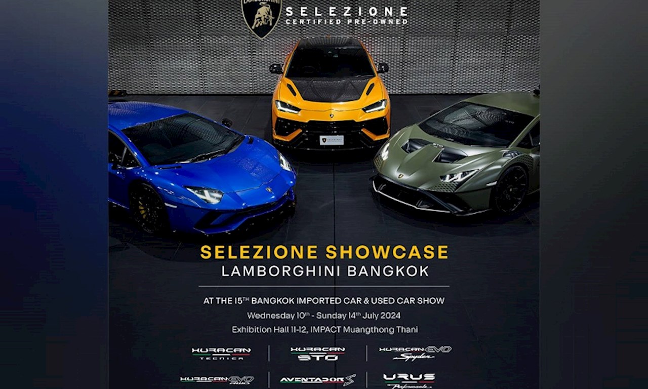 บริษัท เรนาสโซ มอเตอร์ จำกัด ตัวแทนจำหน่ายรถยนต์ลัมโบร์กินีอย่างเป็นทางการรายเดียวในประเทศไทย นำโดย อภิชาติ ลีนุตพงษ์ ประธานกรรมการ, ศักดิ์ นานา และ ม.ล.พลอยนภัส ลีนุตพงษ์ กรรมการ ยกทัพ Selezione Certified Pre-owned จัดแสดงในงาน Bangkok Imported Car & Used Car Show ครั้งที่ 15 พร้อมเผยโฉมลัมโบร์กินี Pre-owned ที่ได้รับการรับรองคุณภาพจากทางลัมโบร์กินีและมาตรฐานสูงสุดจากเรนาสโซ มั่นใจด้วยการตรวจสอบประวัติรถได้ทุกคัน มาพร้อมข้อเสนอสุดพิเศษเฉพาะในงาน อาทิ Huracán Tecnica, Huracán STO, Huracán EVO RWD, Aventador S, Huracán EVO Spyder และ Urus Performante ระหว่างวันที่ 10-14 กรกฎาคม 2567 ณ อิมแพ็ค อารีนา เมืองทองธานี, Exhibition Hall 11-12