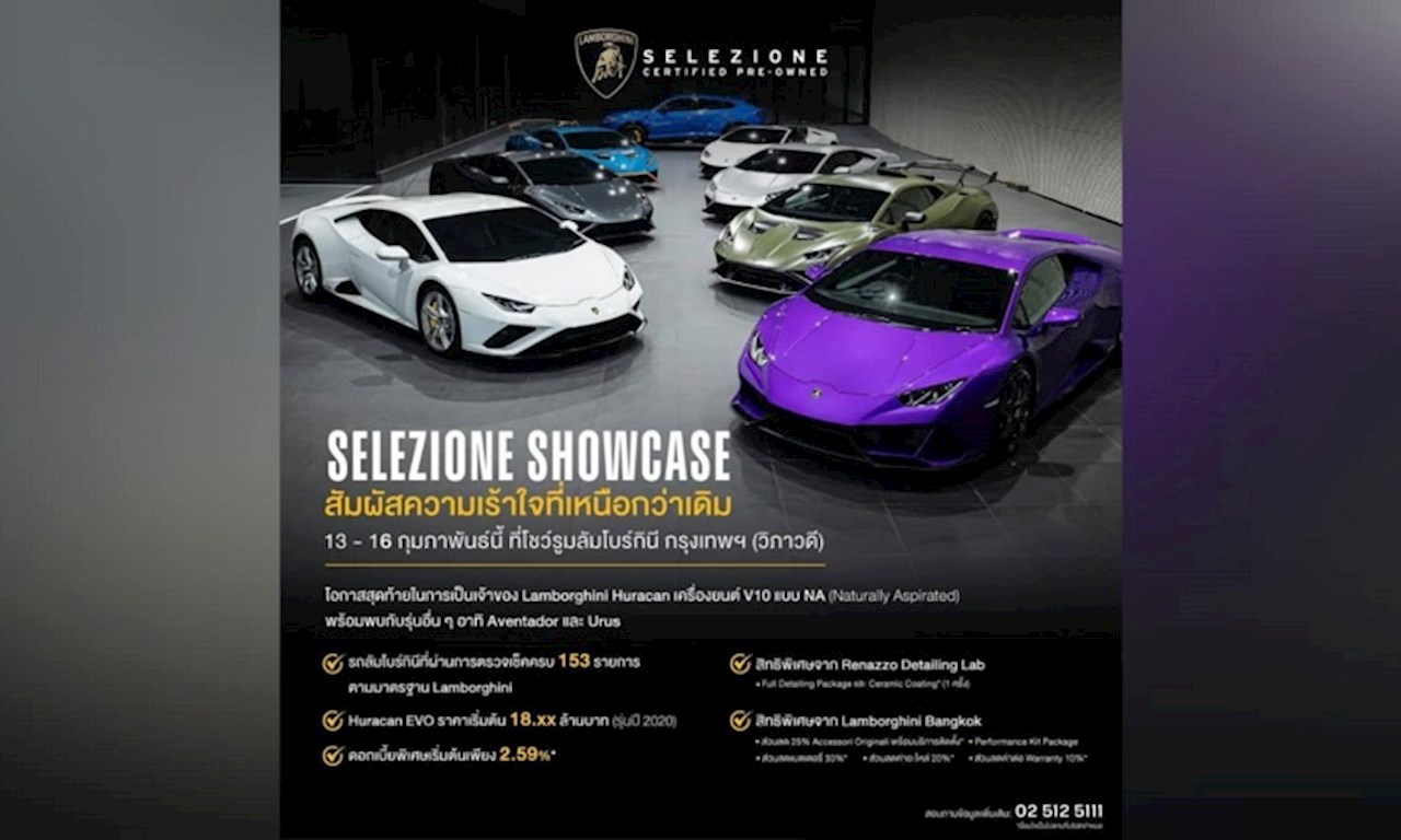 บริษัท เรนาสโซ มอเตอร์ จำกัด ตัวแทนจำหน่ายรถยนต์ลัมโบร์กินีอย่างเป็นทางการรายเดียวในประเทศไทย นำโดย อภิชาติ ลีนุตพงษ์ ประธานกรรมการ, ศักดิ์ นานา และ ม.ล.พลอยนภัส ลีนุตพงษ์ กรรมการ ยกทัพ Lamborghini Selezione Certified Pre-owned กว่า 30 คัน เผยโฉมลัมโบร์กินี Pre-owned ที่ผ่านการตรวจเช็คประวัติรถและ 153 รายการ ตามมาตรฐานโรงงาน Lamborghini และพร้อมส่งมอบทันที ซึ่งเป็นโอกาสทองที่ผู้ซื้อและผู้ขายจะได้พบกันโดยตรง มาพร้อมกับข้อเสนอสุดพิเศษเฉพาะในงาน ที่เรียกได้ว่าเป็นดีลที่คุ้มที่สุดและดีที่สุดแห่งปี