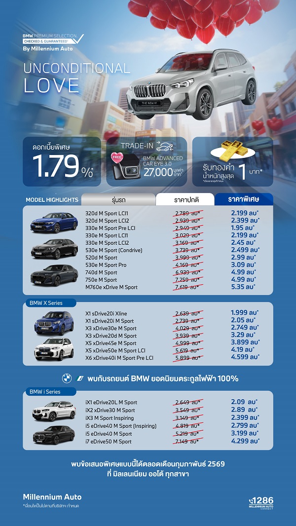วาเลนไทน์ปีนี้ อบอวลด้วยกลิ่นอายแห่งความรัก กับกิจกรรม ‘UNCONDITIONAL LOVE’ ระหว่างวันที่ 13-15 กุมภาพันธ์ 2569 ที่โชว์รูมมิลเลนเนียม ออโต้ สาขาพระราม 4 เพลิดเพลินกับเวิร์กช็อปด้านศิลปะและความงาม พร้อมข้อเสนอพิเศษสำหรับลูกค้า บีเอ็มดับเบิลยู อาทิ ดอกเบี้ยพิเศษเริ่มต้น 1.99% สิทธิ์รับประกันภัยชั้นหนึ่งหรือ BSI Ultimate Upgrade รวมถึงสิทธิพิเศษสำหรับลูกค้าที่นำรถคันเก่ามาแลกรถใหม่ ห้ามพลาดกับกิจกรรมทดลองขับ BMW M2 LCI และ BMW XM ที่มีเฉพาะในงานนี้เท่านั้น