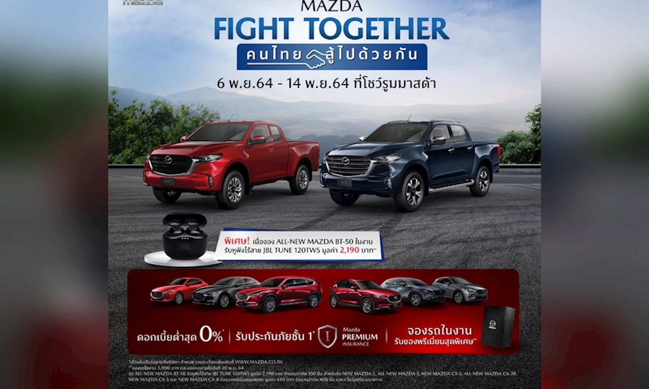 เตรียมเปิดเกมส์รุกกระตุ้นกำลังซื้อในช่วงปลายปีเต็มกำลัง ด้วยการส่งแคมเปญ MAZDA FIGHT TOGETHER ปลุกพลังใจให้คนไทยสู้ไปด้วยกัน ด้วยการขอความร่วมมือให้ผู้จำหน่ายในแต่ละพื้นที่ให้ความช่วยเหลือธุรกิจ SME ของลูกค้าให้กลับมาเริ่มต้นเดินหน้าทำธุรกิจได้อีกครั้งหลังจากต้องเผชิญกับวิกฤตโควิดมาตลอดเกือบ 2 ปี พร้อมมอบข้อเสนอสุดพิเศษเพื่อให้ลูกค้าเป็นเจ้าของยนตรกรรมมาสด้าได้ง่ายขึ้น กับดอกเบี้ยต่ำสุด 0% ฟรีประกันภัยชั้น 1 รับของพรีเมี่ยมสุดพิเศษเมื่อจองภายในงาน ระหว่างวันที่ 6 – 14 พฤศจิกายน 2564 ที่โชว์รูมมาสด้า