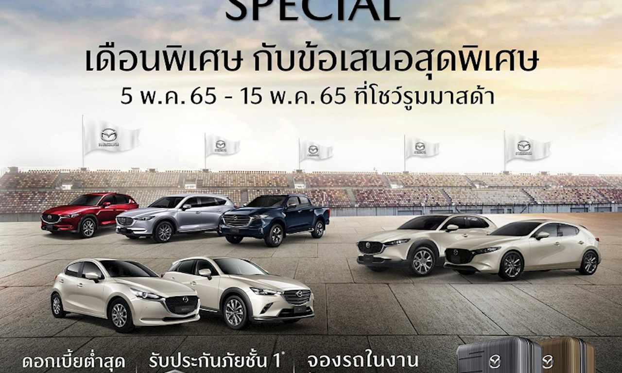 มาสด้าสุดปลื้มเปิดศักราชปีงบประมาณใหม่ ยอดขายเดือนเมษายนเติบโต 25% เผยข่าวดีเดือนพฤษภาคมอัดแคมเปญหนักกว่าเดิม มอบความคุ้มยิ่งกว่าภายใต้แคมเปญ “MAZDA MAY DAY SPECIAL” เดือนพิเศษกับข้อเสนอสุดพิเศษ ดอกเบี้ยต่ำสุด 0% ฟรีประกันชั้น 1 Mazda Premium Insurance1 ฟรี Mazda Mini Luggage มูลค่า 1,500 บาท ระหว่างวันที่ 5 พ.ค. 65 ถึงวันที่ 15 พ.ค. 65 พร้อมมอบดีลพิเศษชุดแต่งแท้จากมาสด้า ทั้ง MAZDASPEED และ MAZDA KENSHO รับส่วนลดพิเศษ 10% และผ่อนชำระ 0% นานสูงสุด 10 เดือน ตลอดเดือนพฤษภาคม และอีกหนึ่งข้อเสนอให้ลูกค้าคนไทยก้าวต่อไป กับ “มาสด้า บีที-50 ใหม่ คนไทยก้าวไปด้วยกัน” ดาวน์ต่ำ 15% ผ่อนนาน 84 เดือน และฟรีประกันภัยชั้น 11 Mazda Premium Insurance ระหว่างวันที่ 1 พ.ค. 65 – 31 พ.ค. 65 ที่โชว์รูมมาสด้าทั่วประเทศ