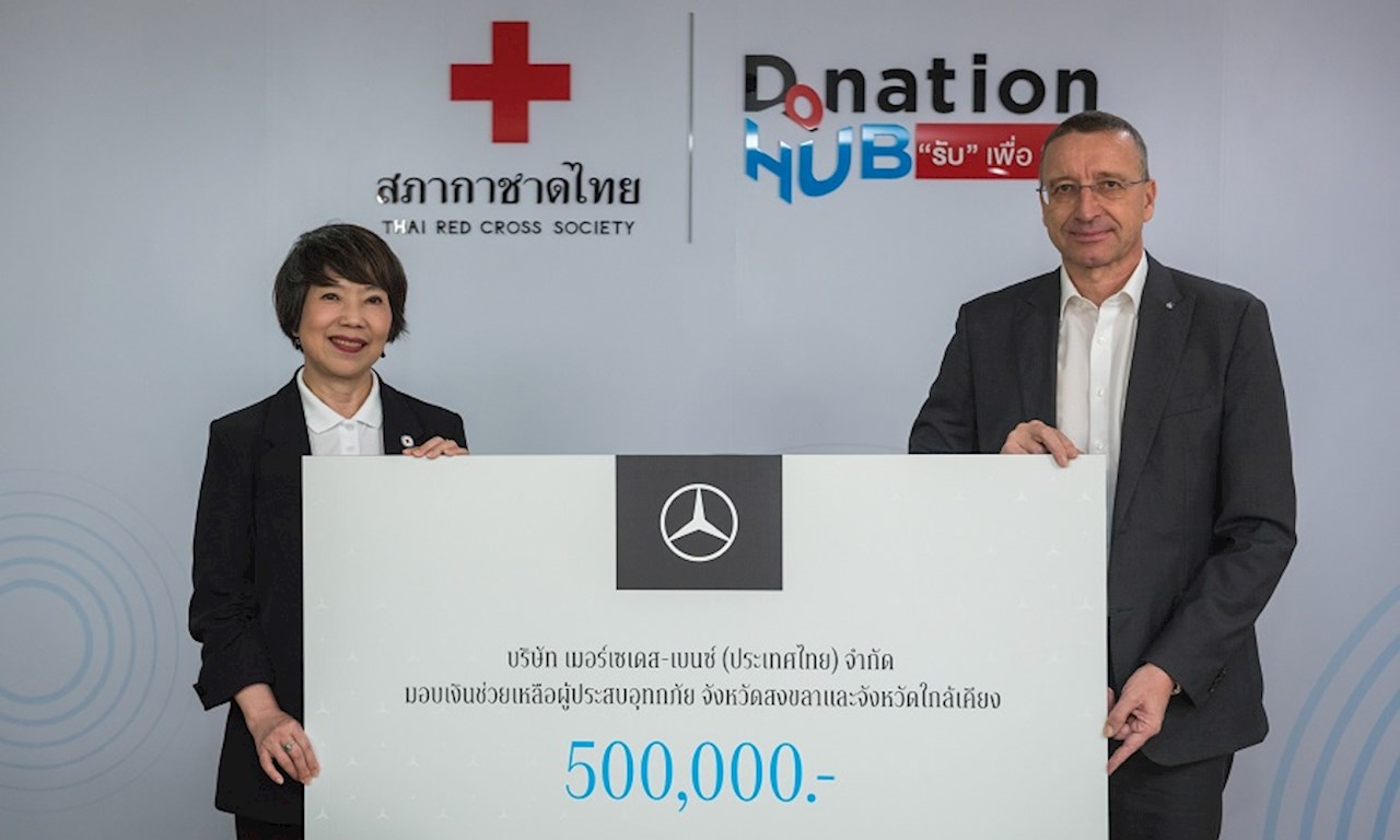 เมอร์เซเดส-เบนซ์ ประเทศไทย ร่วมเป็นส่วนหนึ่งในการช่วยเหลือผู้ประสบอุทกภัยในทุกพื้นที่ โดยเฉพาะจังหวัดสงขลาและจังหวัดใกล้เคียง โดยส่งมอบเงินบริจาคให้กับสภากาชาดไทยจากแคมเปญเปลี่ยนยอดจองรถยนต์ในงาน Motor Expo 2025 เป็นยอดบริจาคเป็นจำนวน 500 บาท ต่อ 1 ใบจอง ซึ่งหลังจากสิ้นสุดงานมียอดจองรวม 911 คัน ทางบริษัทฯ จึงสมทบยอดบริจาคเพิ่มเติมรวมเป็นจำนวนทั้งสิ้น 500,000 บาท โดยมี มร. มาร์ทิน ชเวงค์ ประธานเจ้าหน้าที่บริหารและกรรมการผู้จัดการใหญ่ บริษัท เมอร์เซเดส-เบนซ์ (ประเทศไทย) จำกัด เป็นผู้ส่งมอบเงินบริจาคให้แก่ นางจันทร์ประภา วิชิตชลชัย รองผู้อำนวยการสำนักงานจัดหารายได้สภากาชาดไทย
